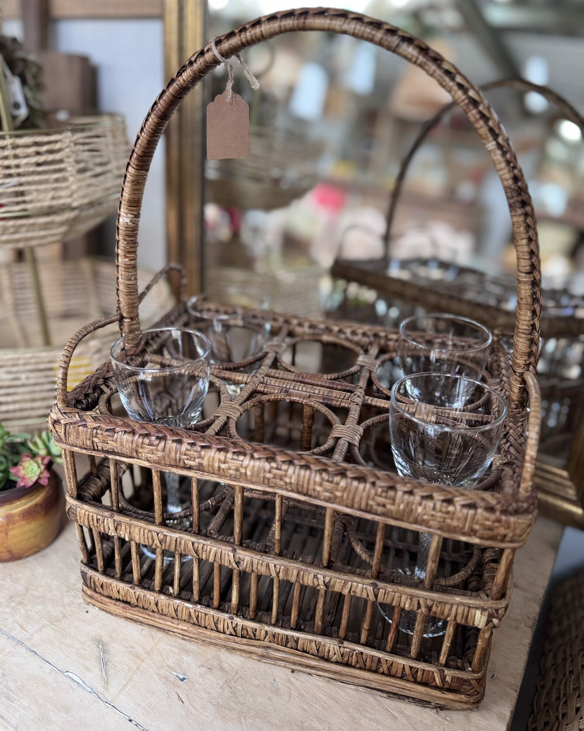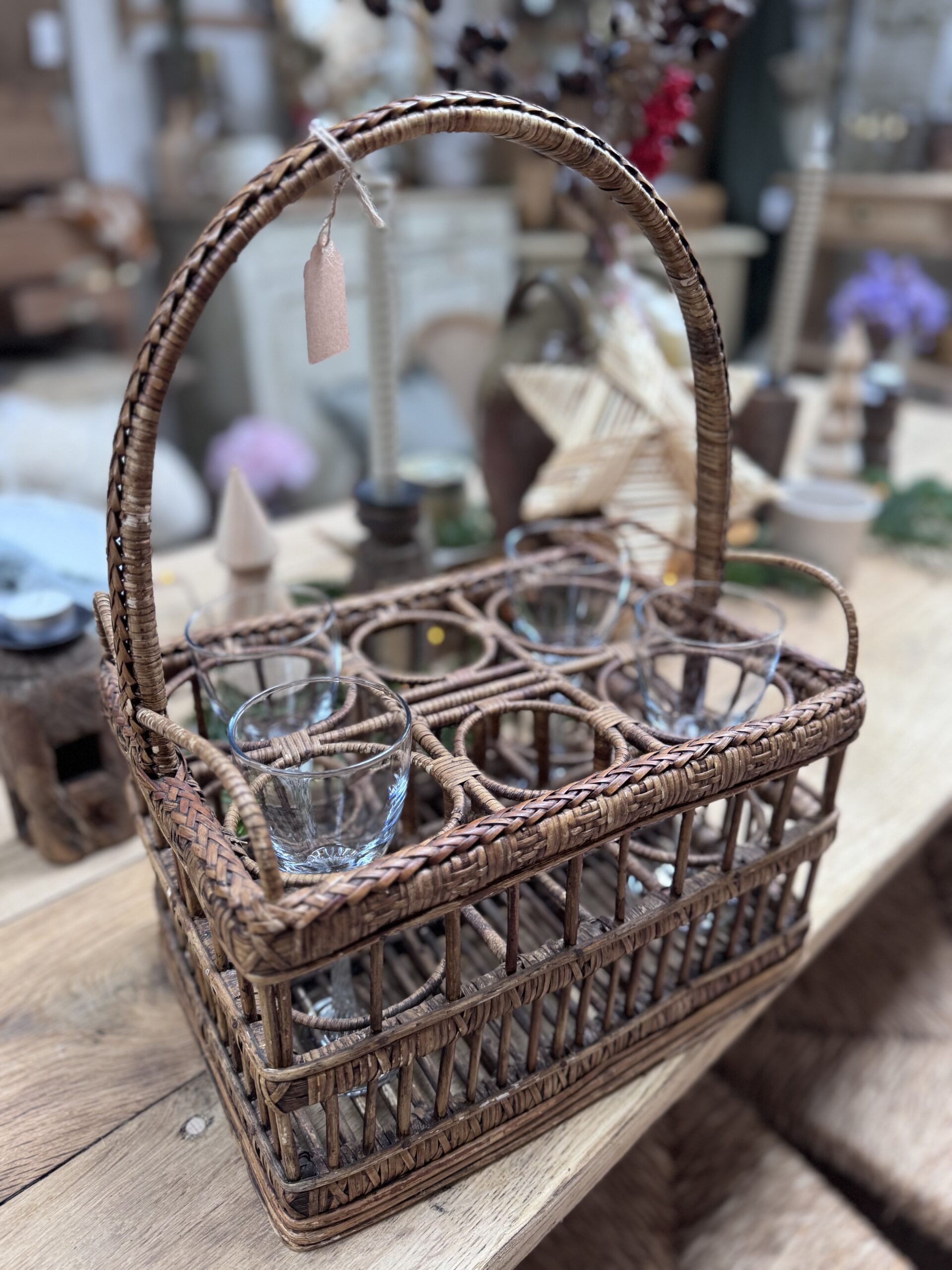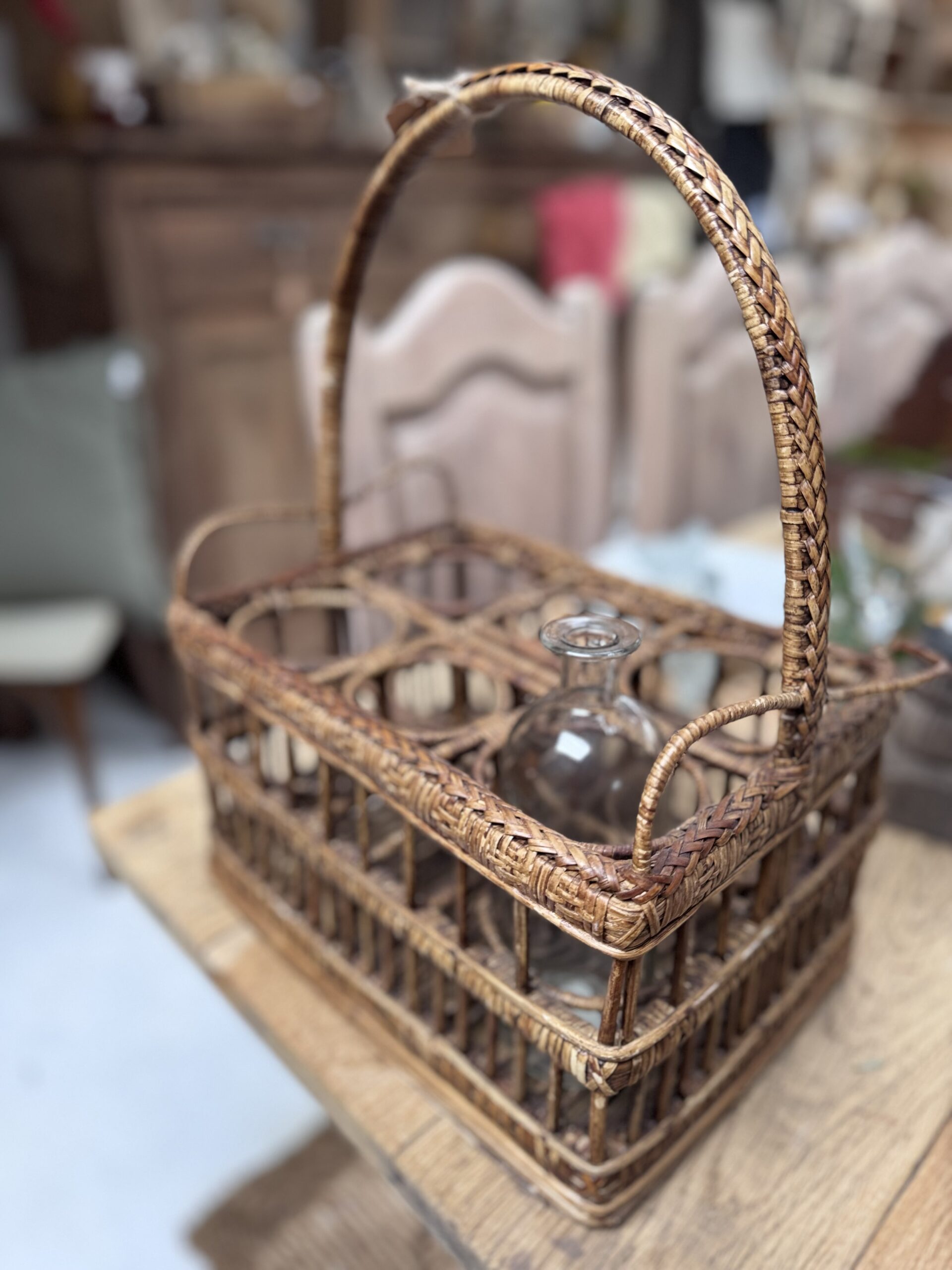 Joli panier à Bouteilles en rotin des années 1900, pour 4 bouteilles et deux verres,