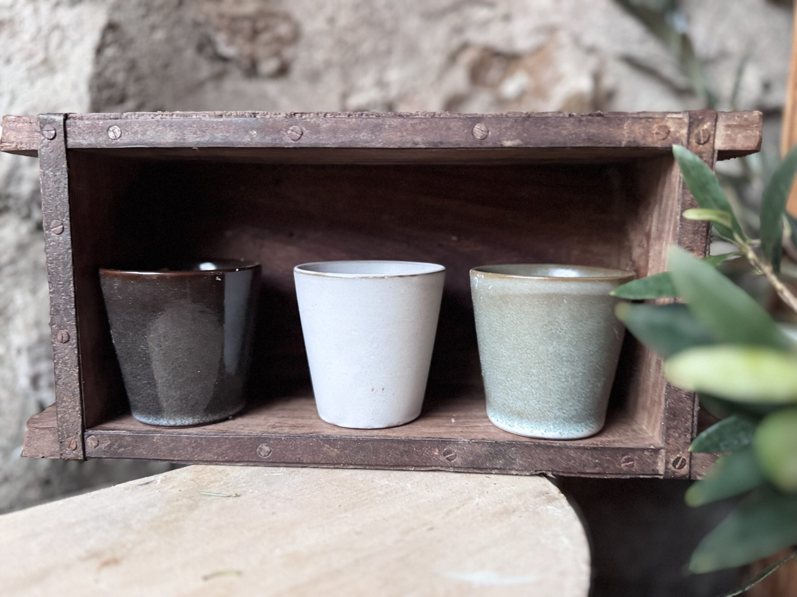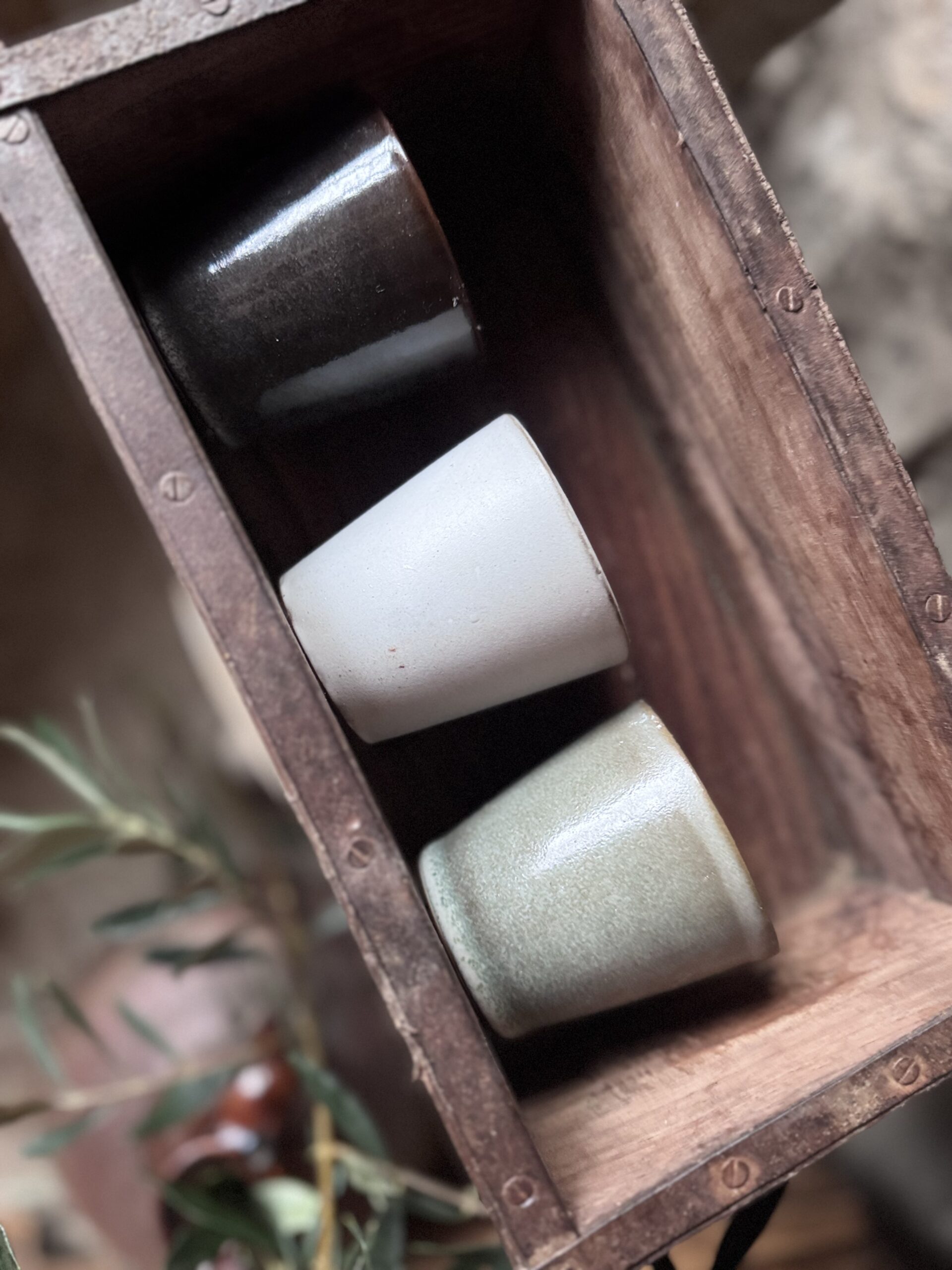 Set de 3 tasses à café en grès signé Madame Stoltz dans les tons beige, vert et brun.
