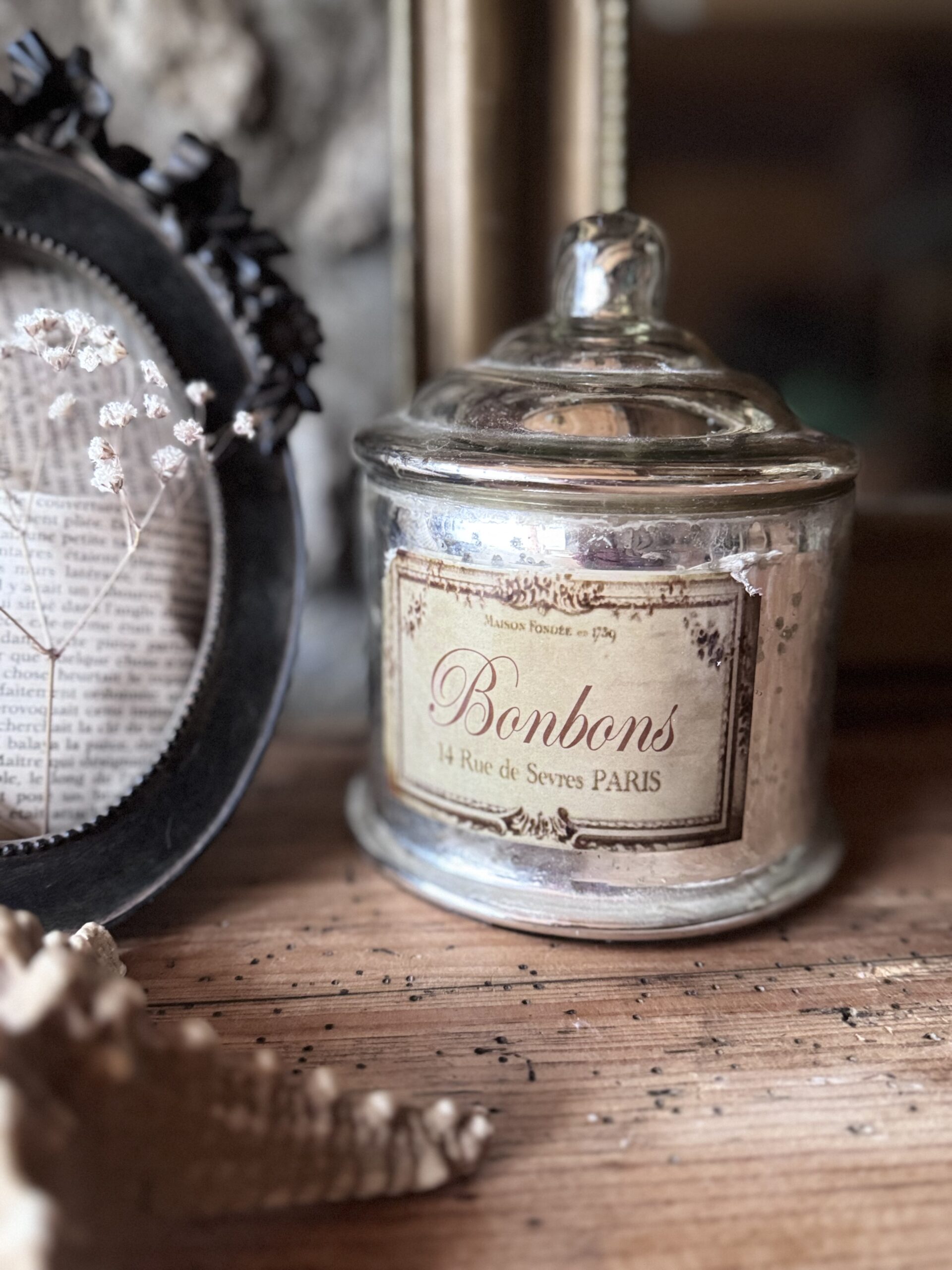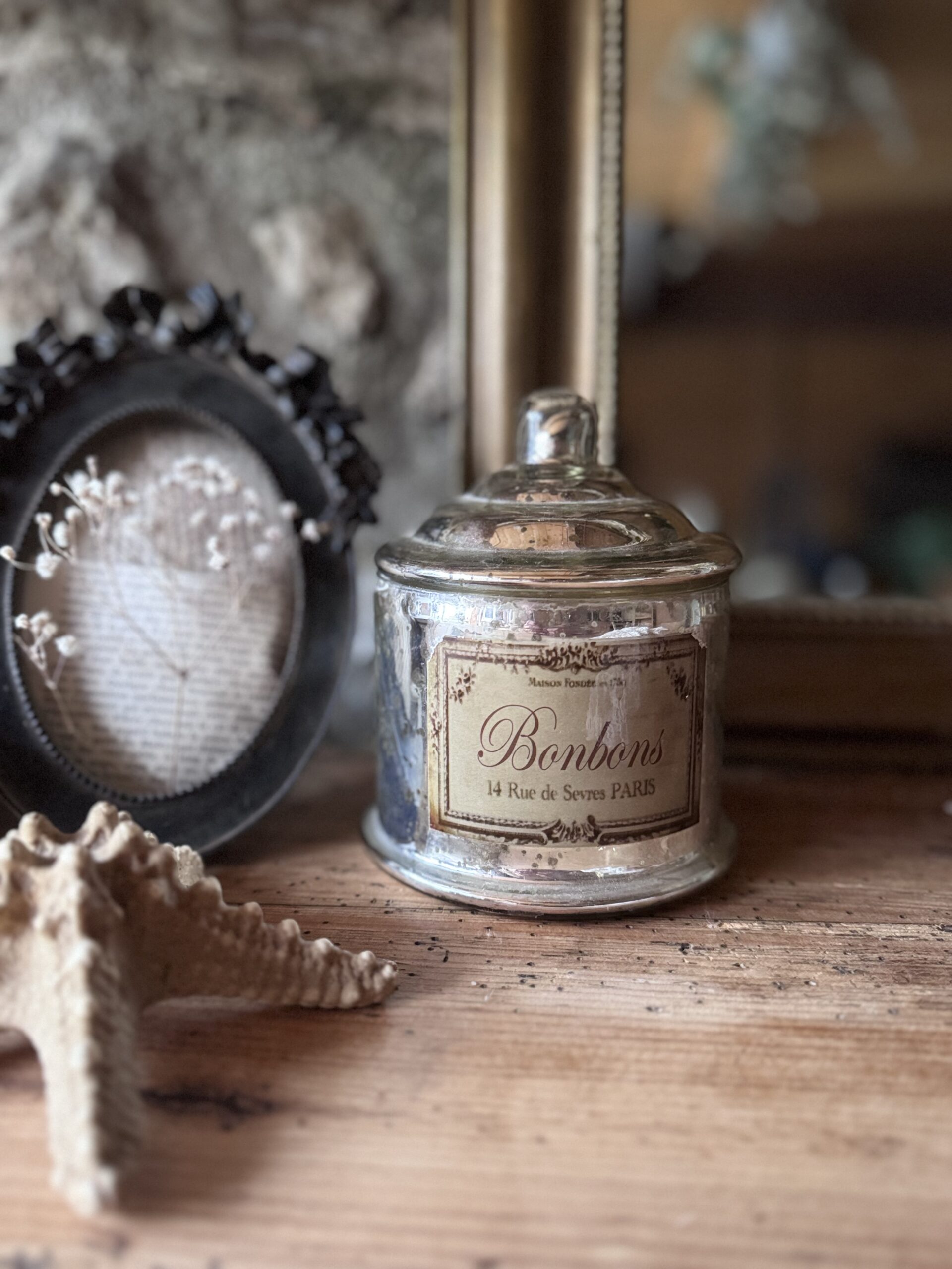Bonbonnière en verre effet mercuré pleine de charme.