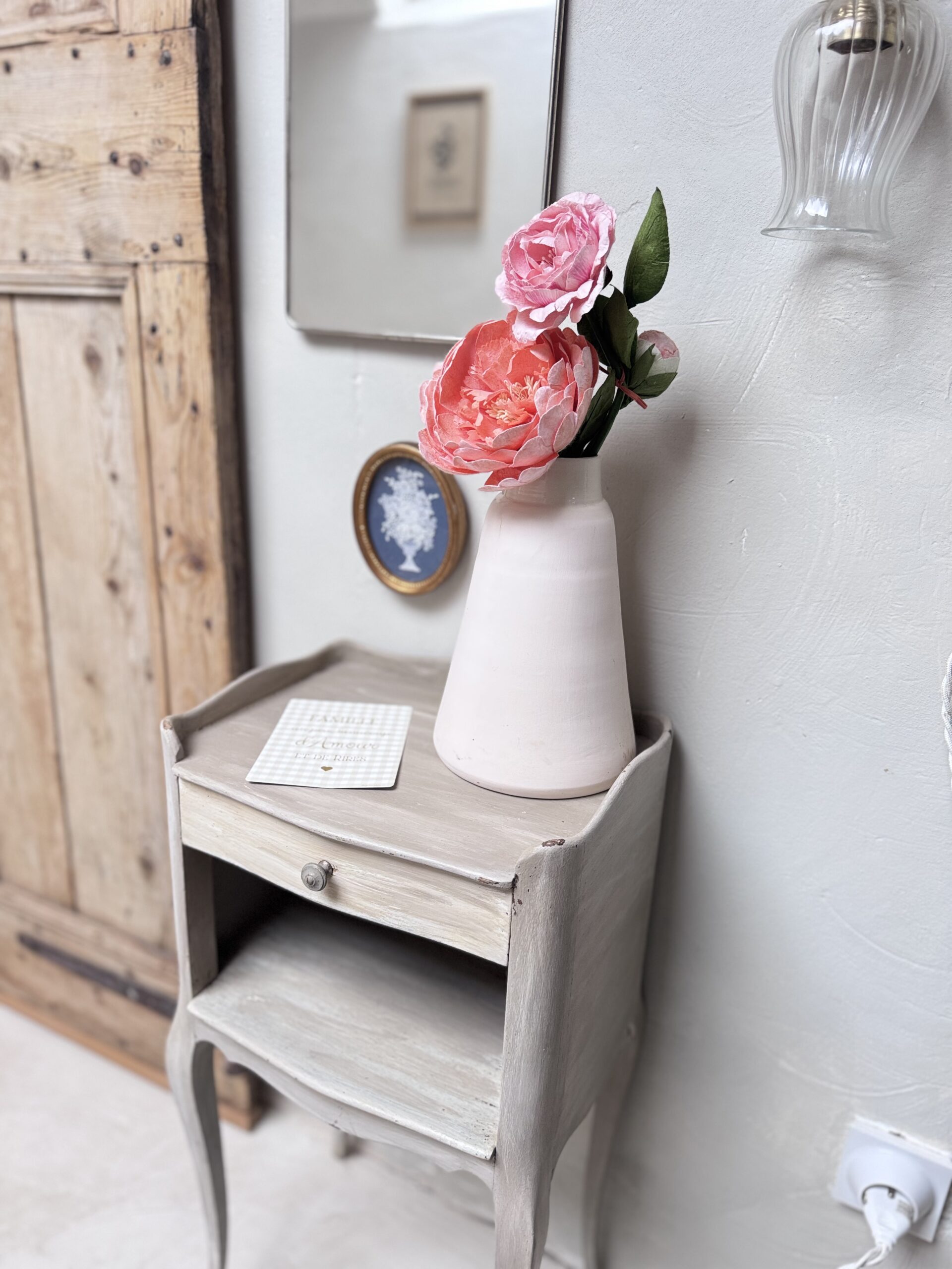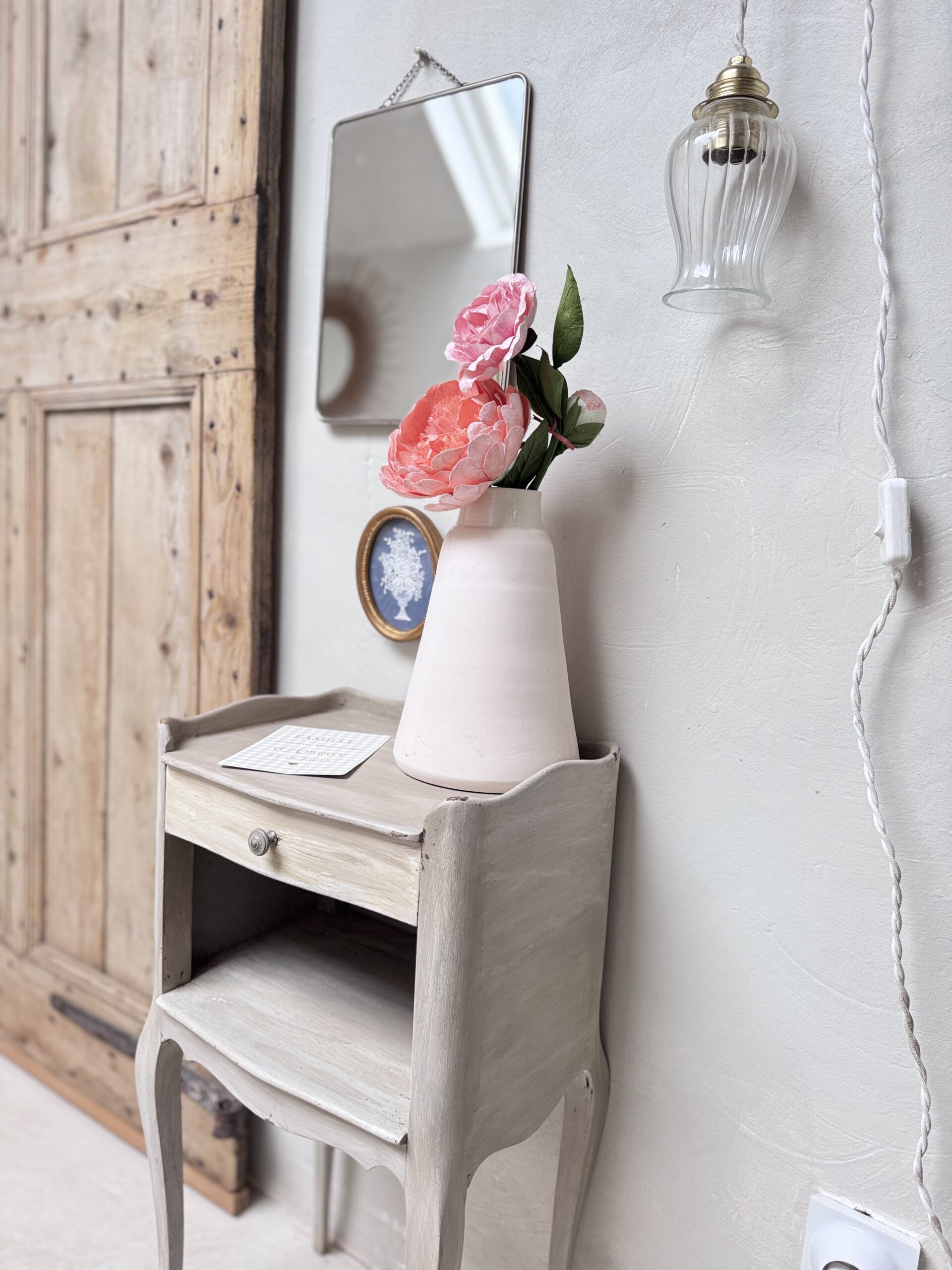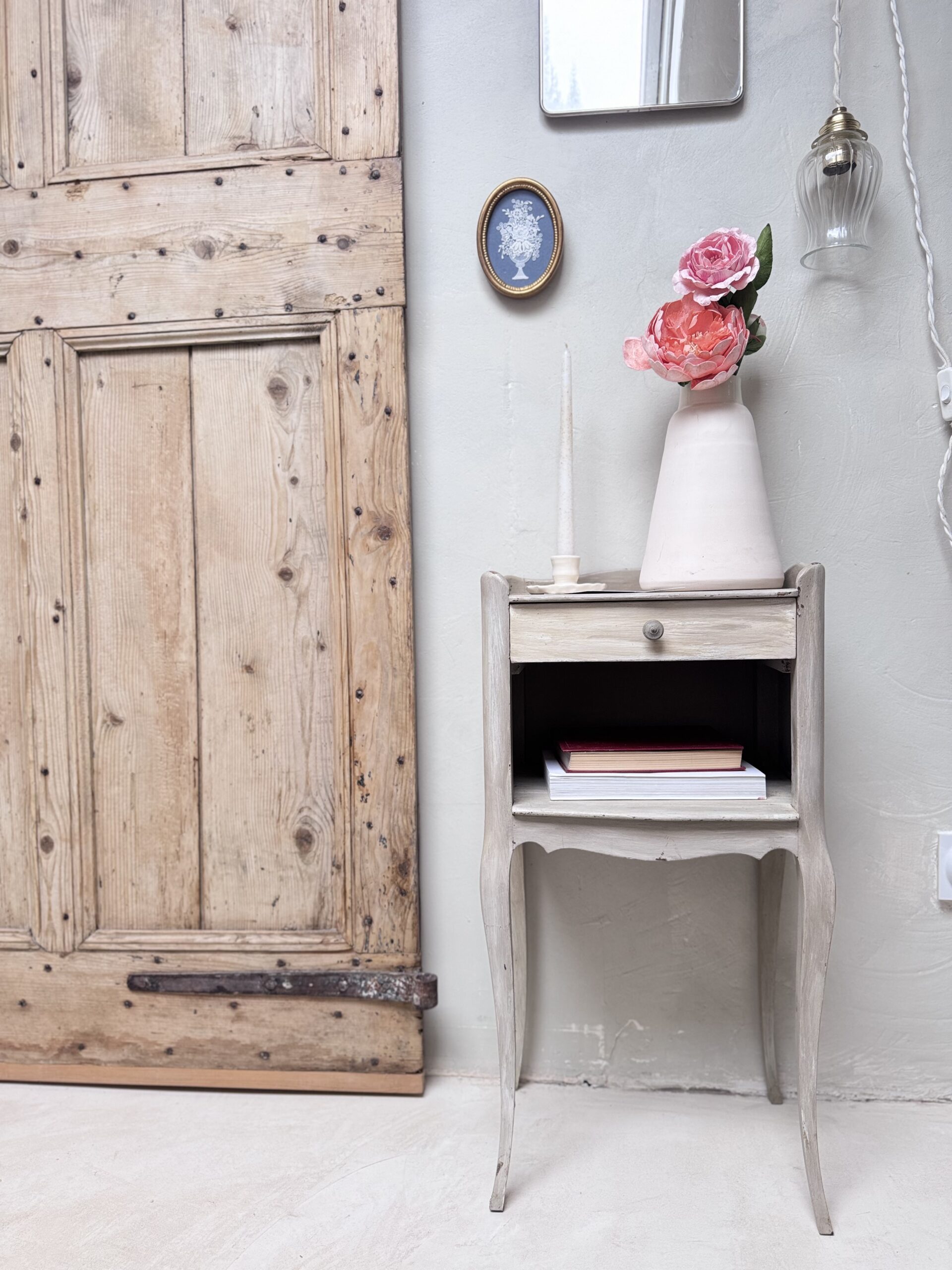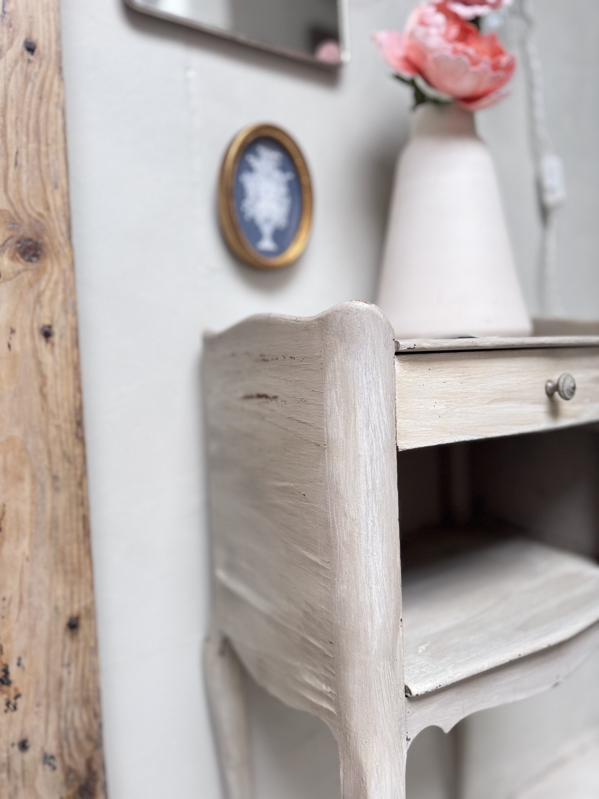 Chevet en bois ou meuble d’appoint style louis XV . Entièrement peint couleur gris taupe avec sa patine à l’ancienne et ses effets usés… Une niche ou coffre ouvert sur la façade ainsi qu’un tiroir avec un bouton métal vieilli.