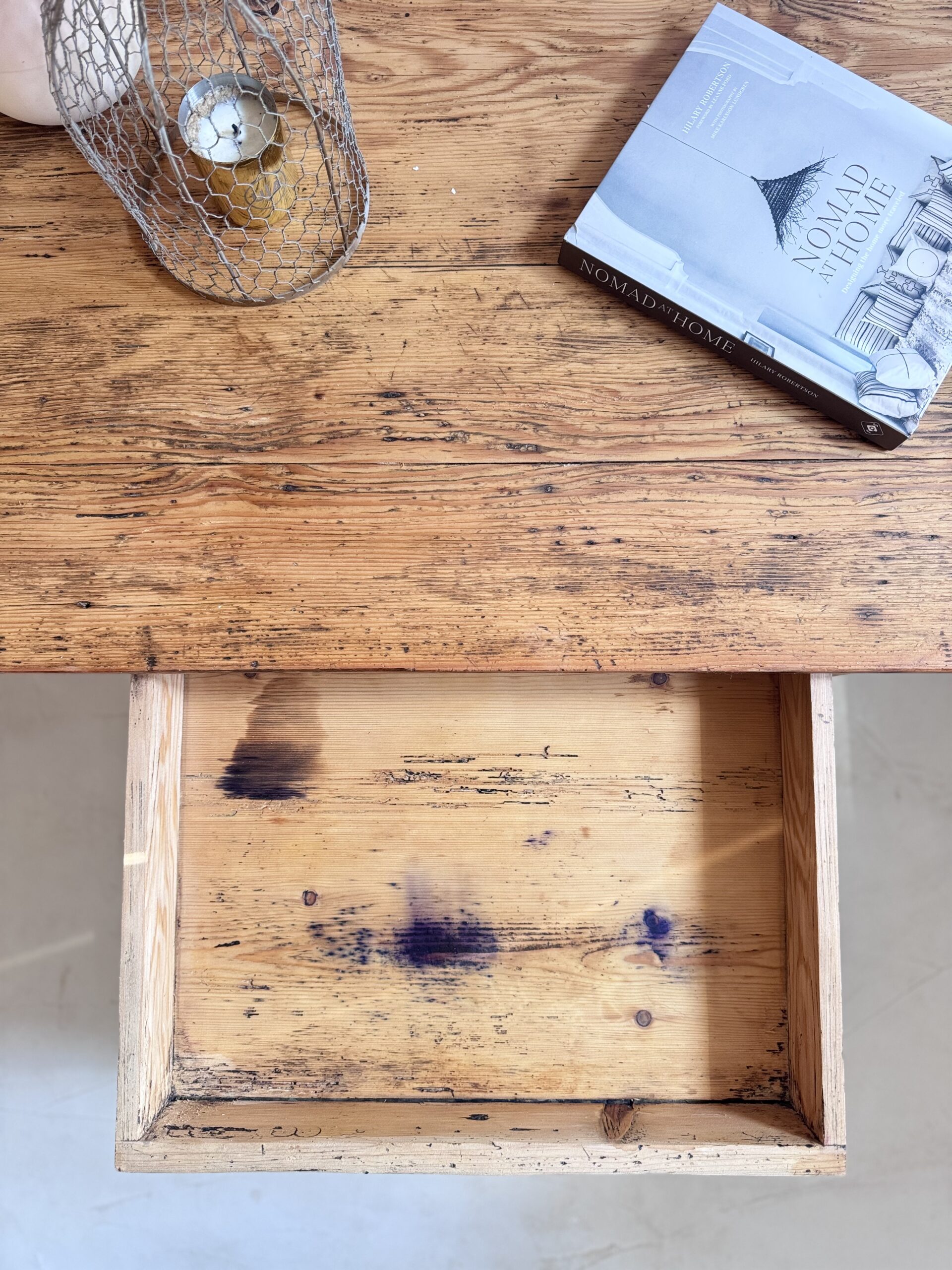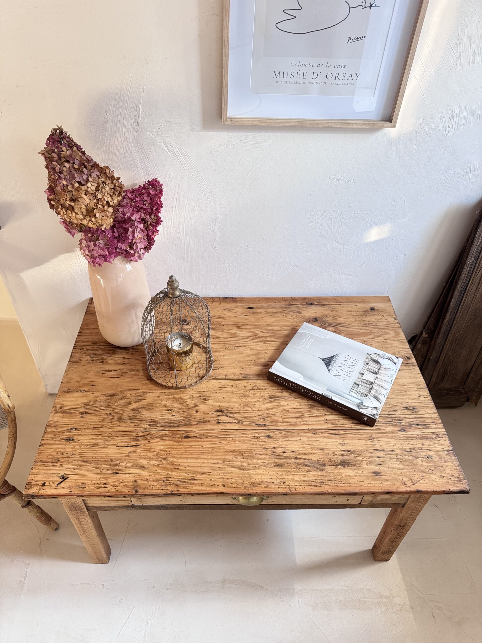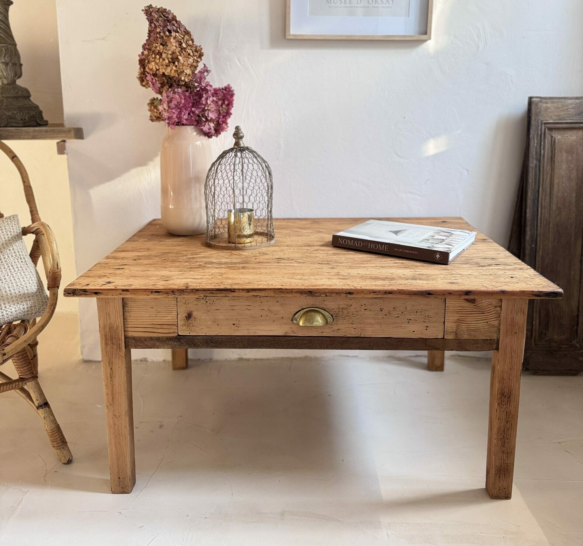 Cette belle table basse en pin massif, au charme intemporel a été sublimée à l’atelier pour écrire une toute nouvelle histoire. Son tiroir en façade, orné d’une élégante poignée coquille en métal doré, allie praticité et raffinement. Cette pièce unique apportera caractère et convivialité à votre intérieur.