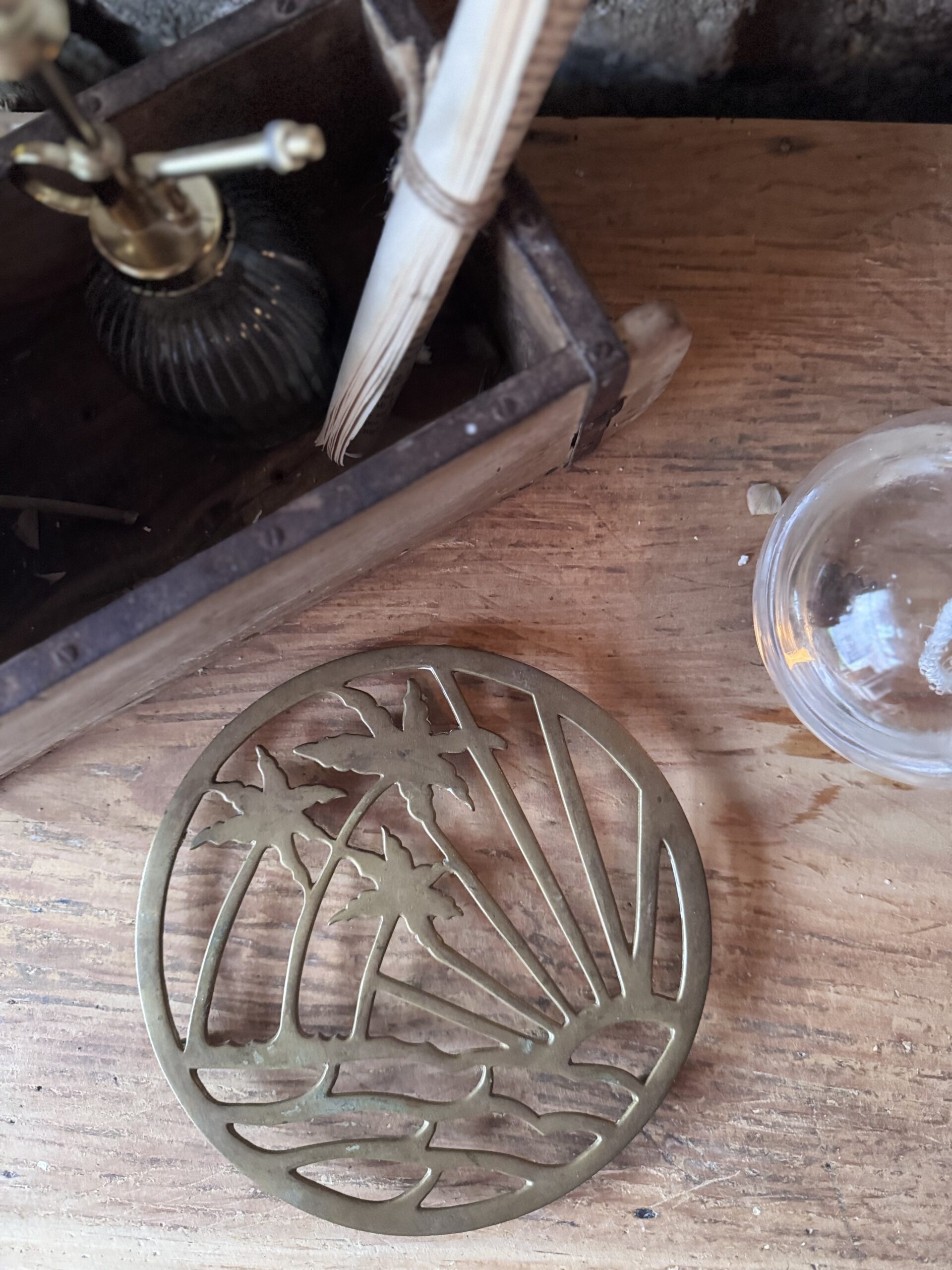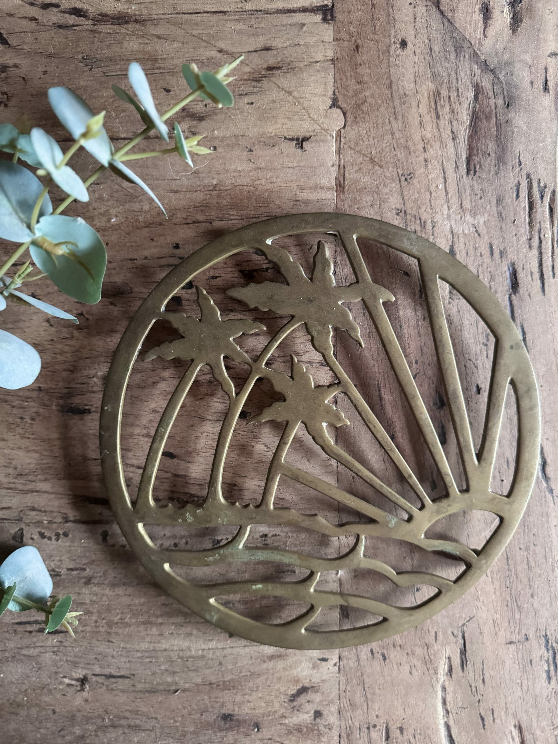 Dessous de plat en laiton des années 70 motif palmier.