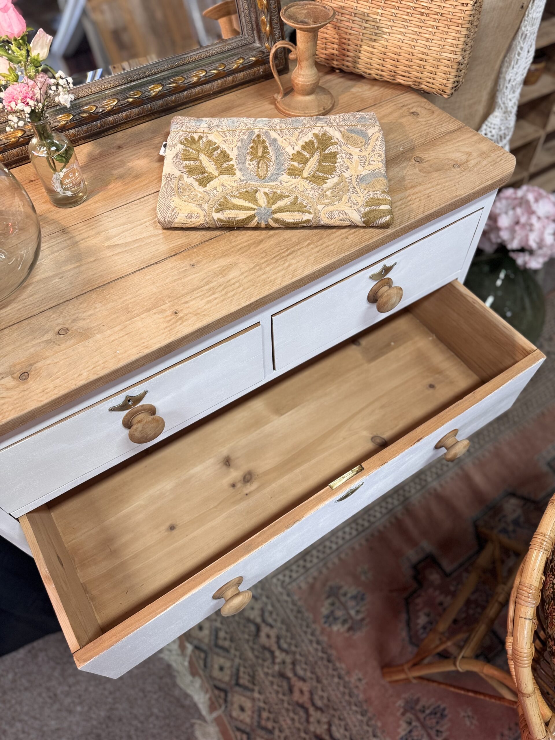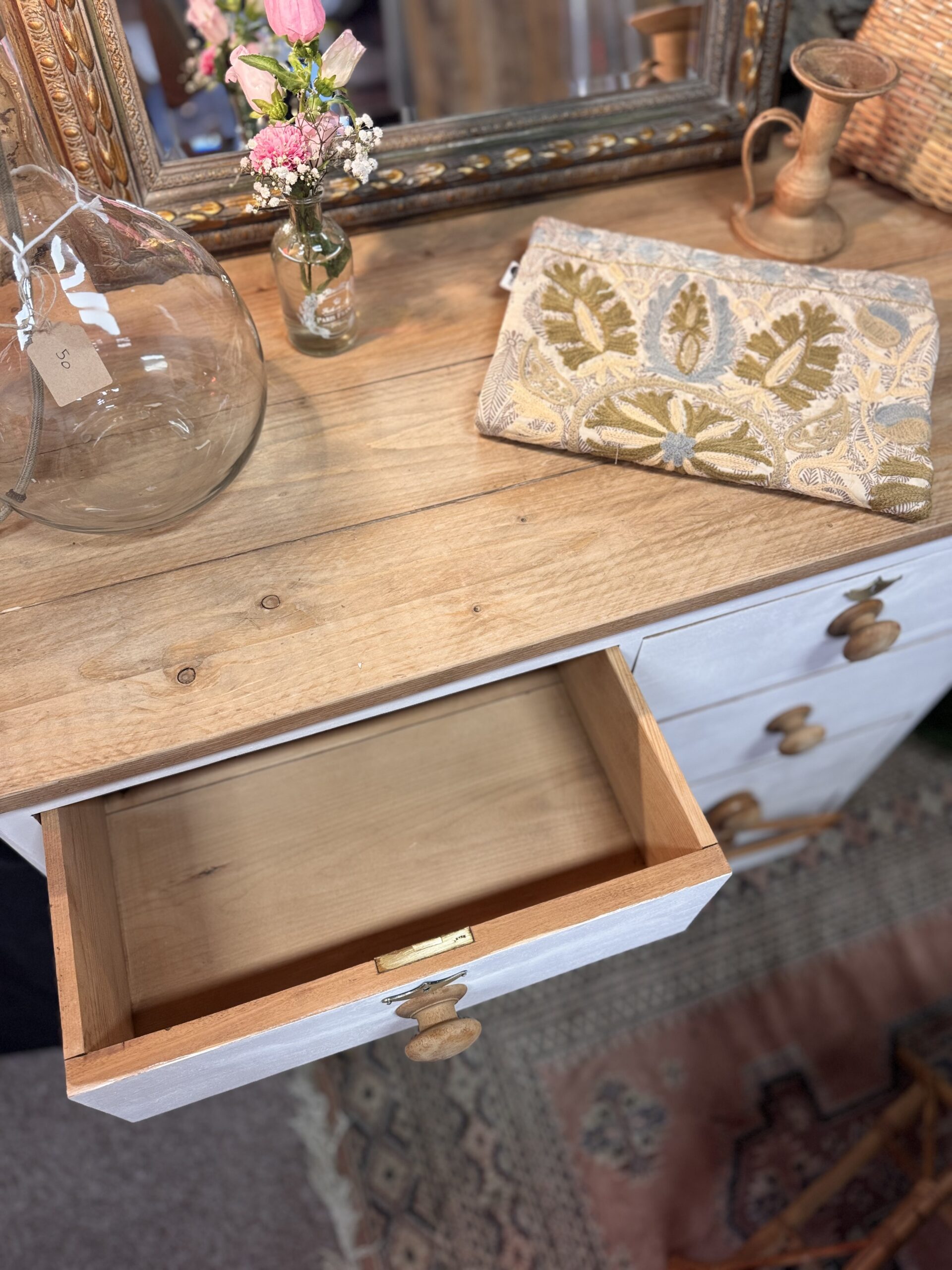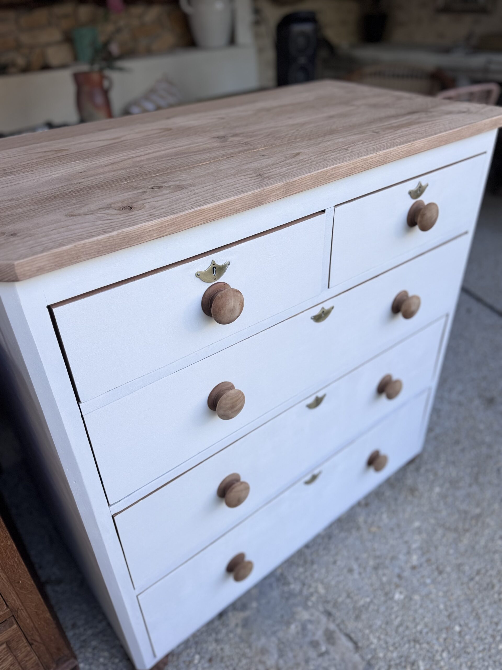 Jolie commode anglaise en bois massif avec ses poignée rondes et ses pieds cannelés d’origine. Entièrement restaurée, poncée et peint en trois couches, le plateau a complètement été changé pour plus de durabilité tout en préservant l’authenticité du meuble.