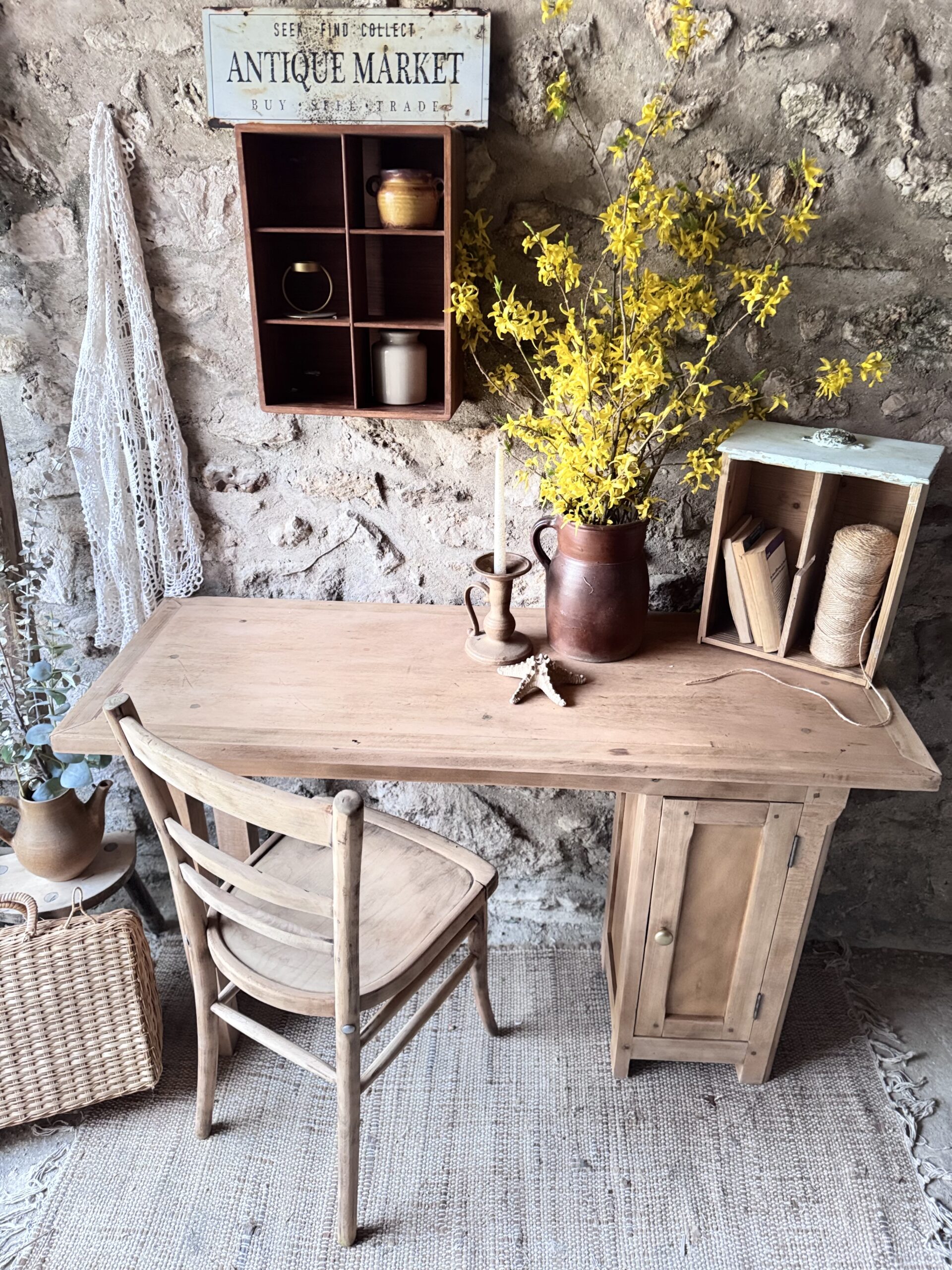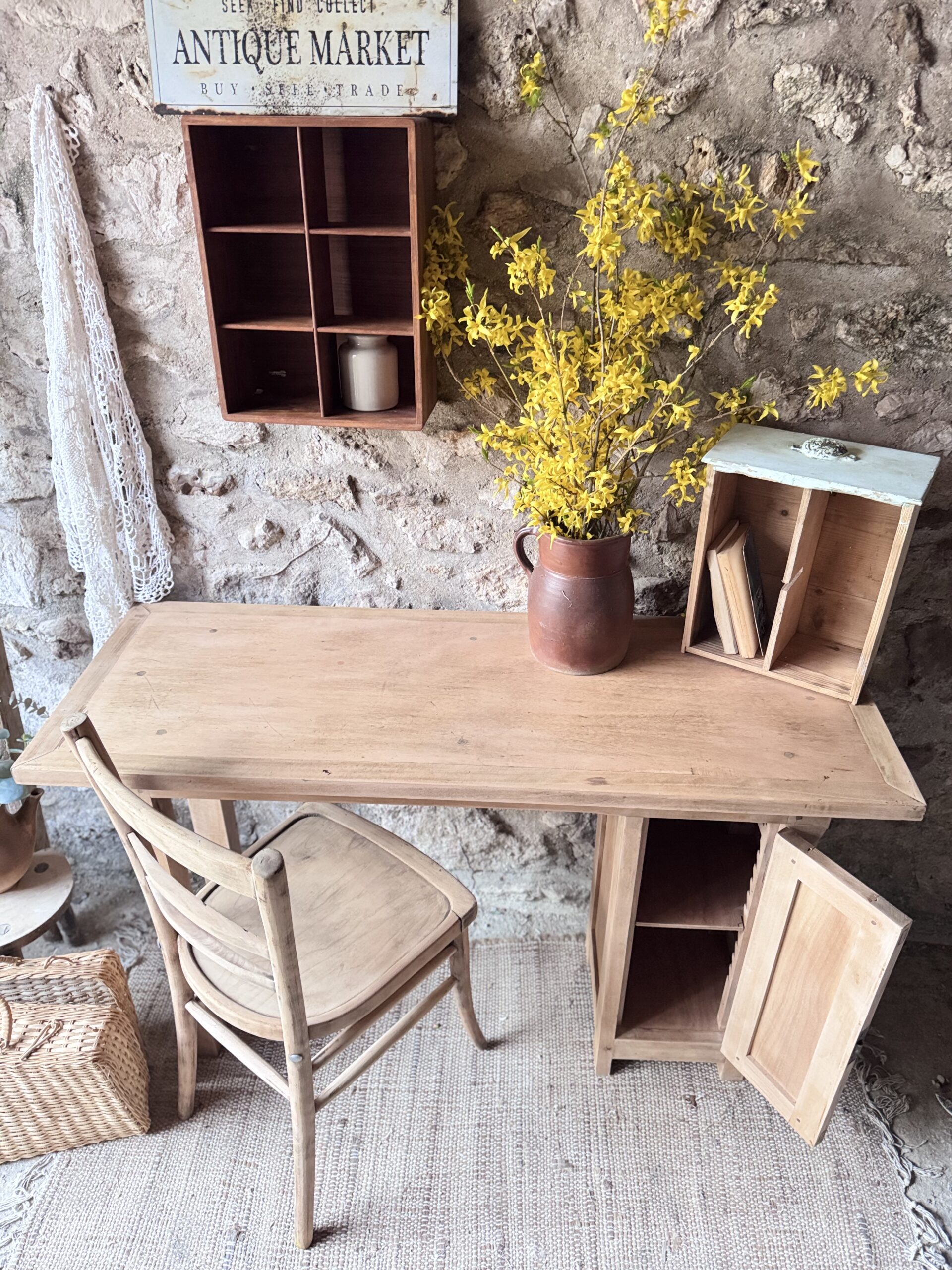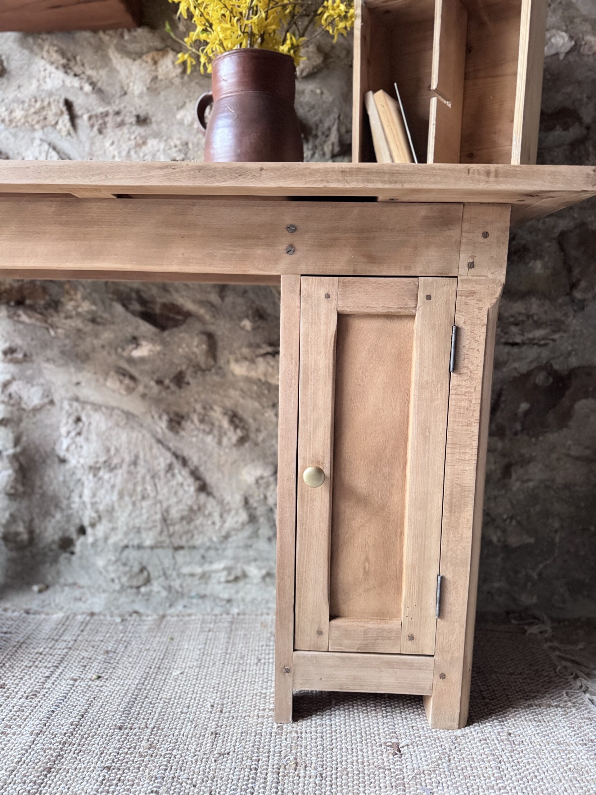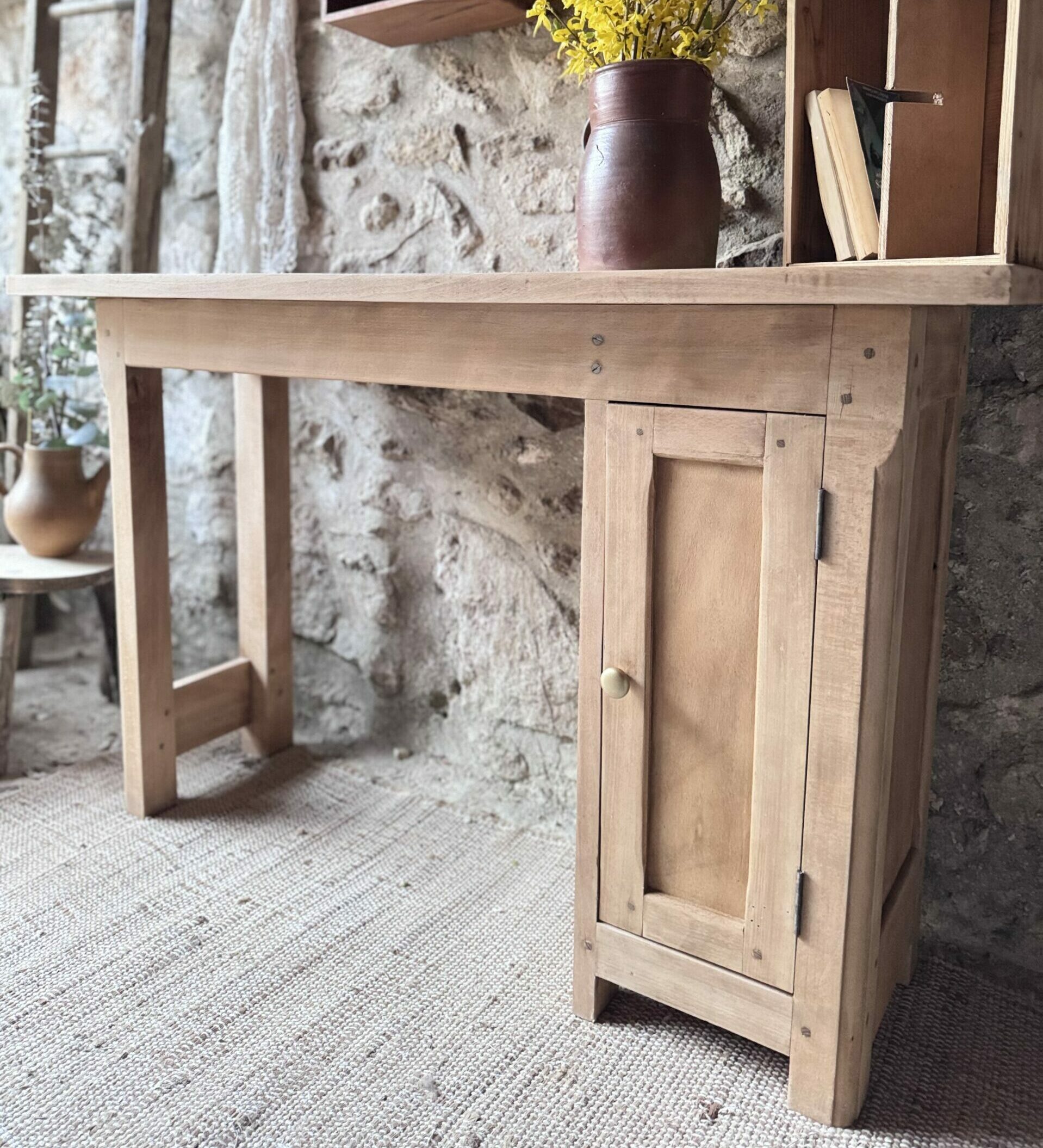 Joli bureau établi en chêne massif et son placard avec une étagère et sa porte doté d’un bouton doré. Le bois possède une belle patine qui en fait un meuble authentique et chaleureux.