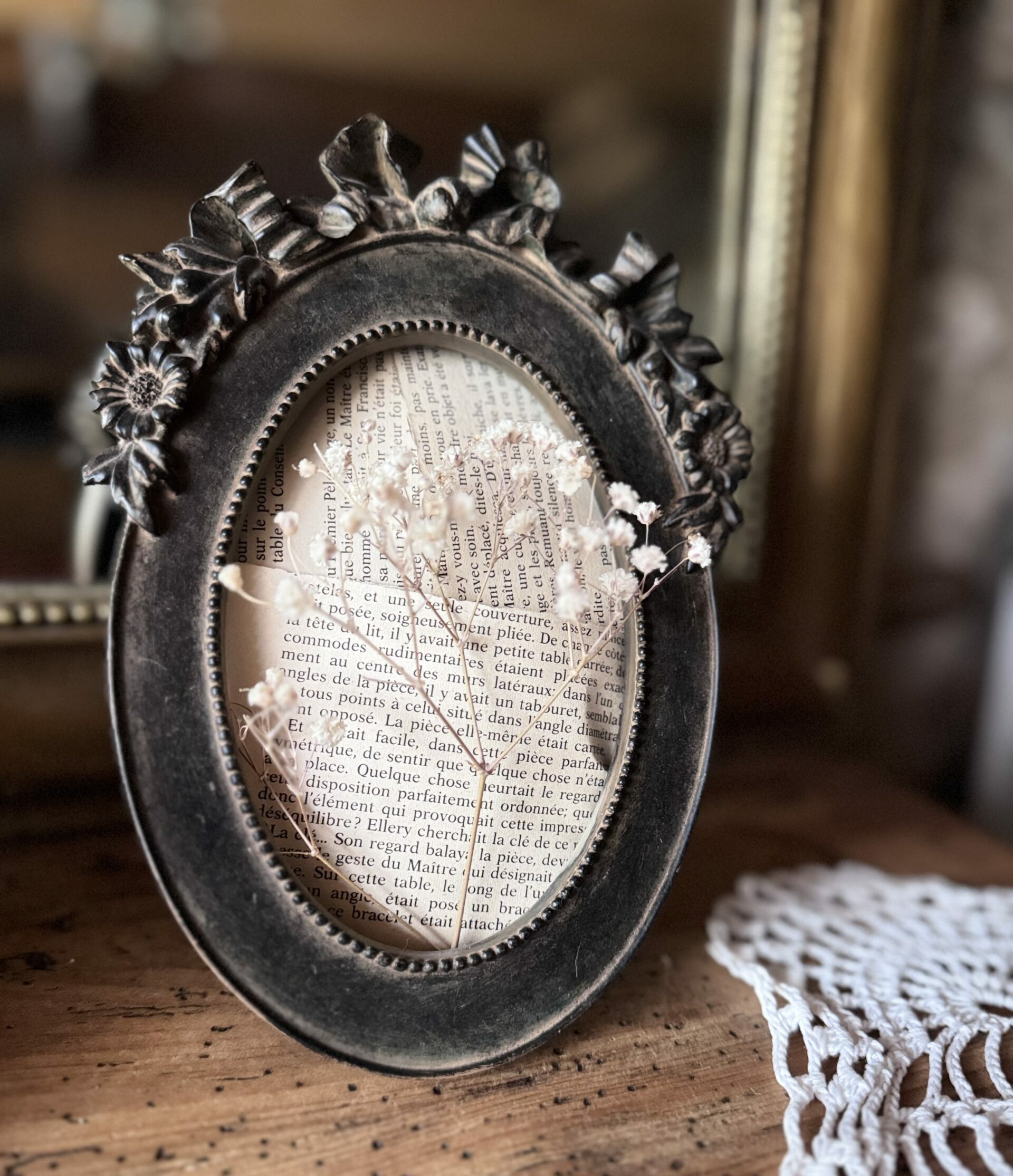 Charmant cadre oval ancien en bois sculpté motif fleur et noeud sans son verre.