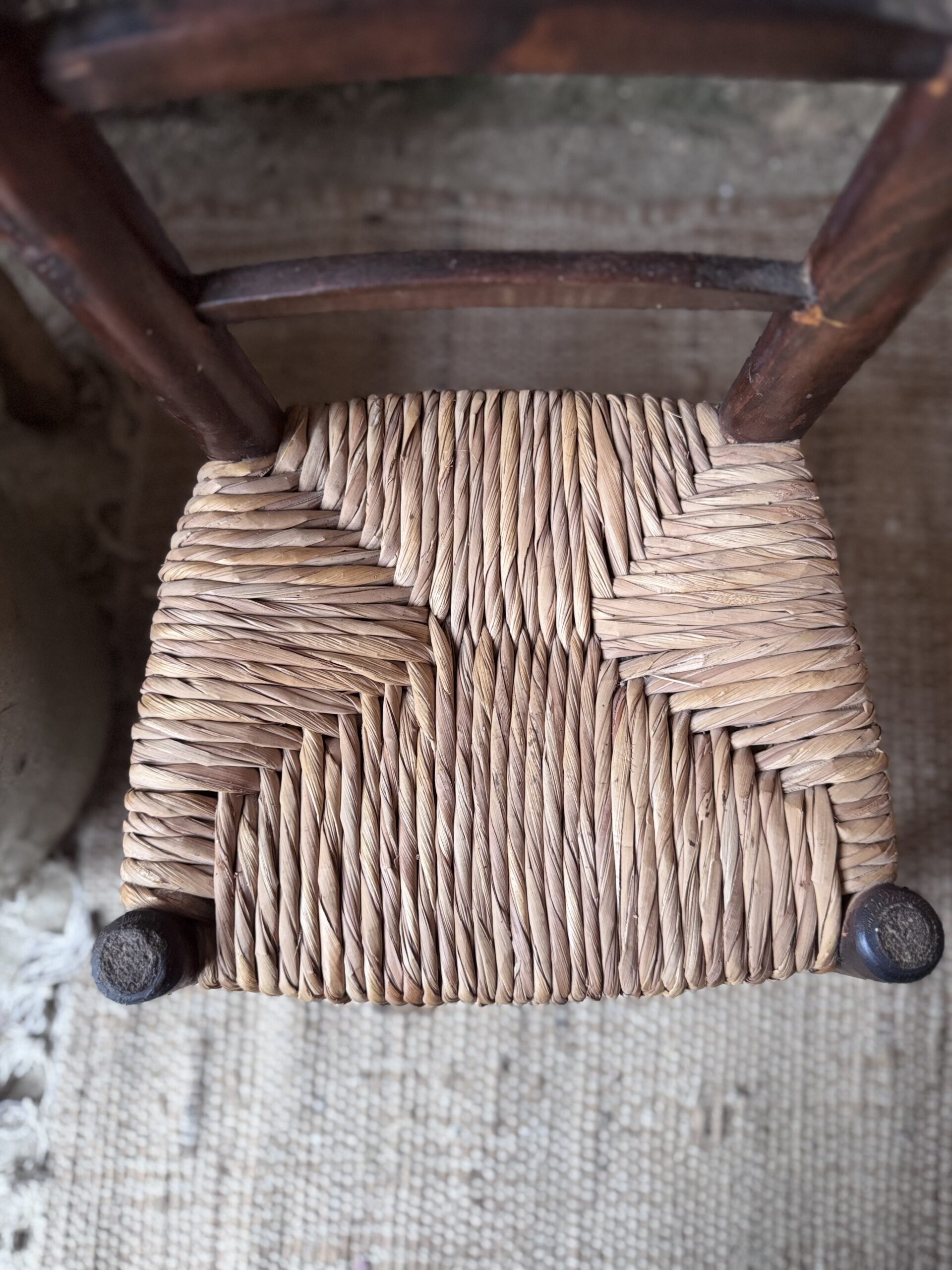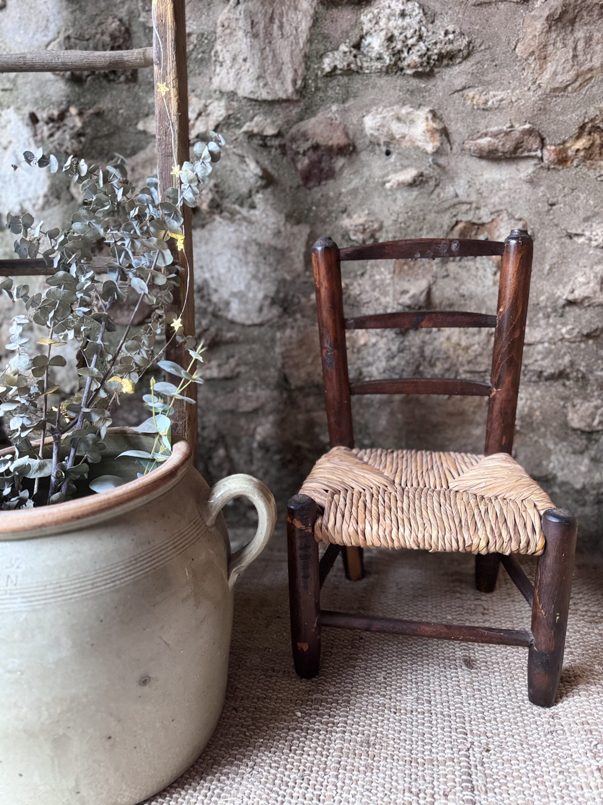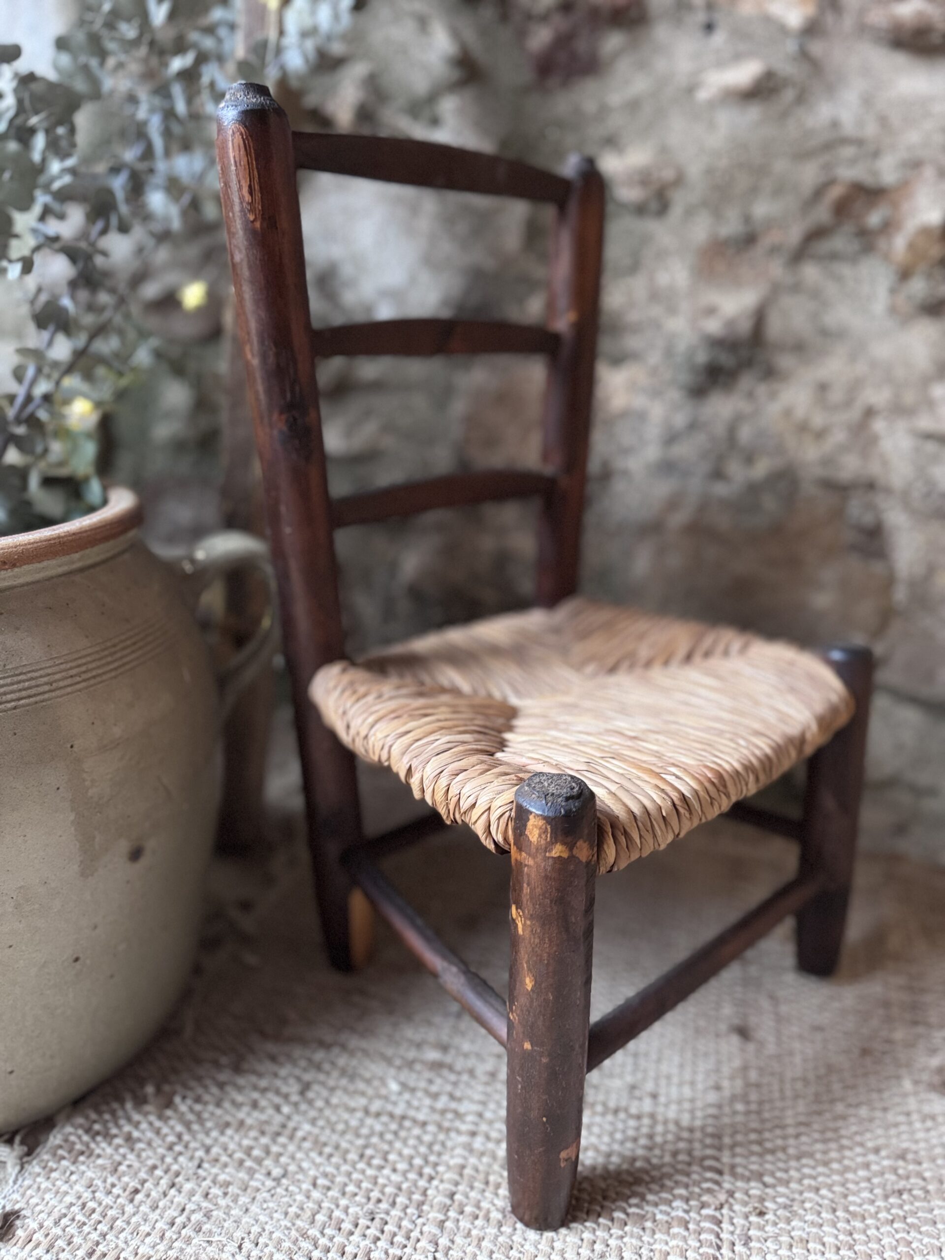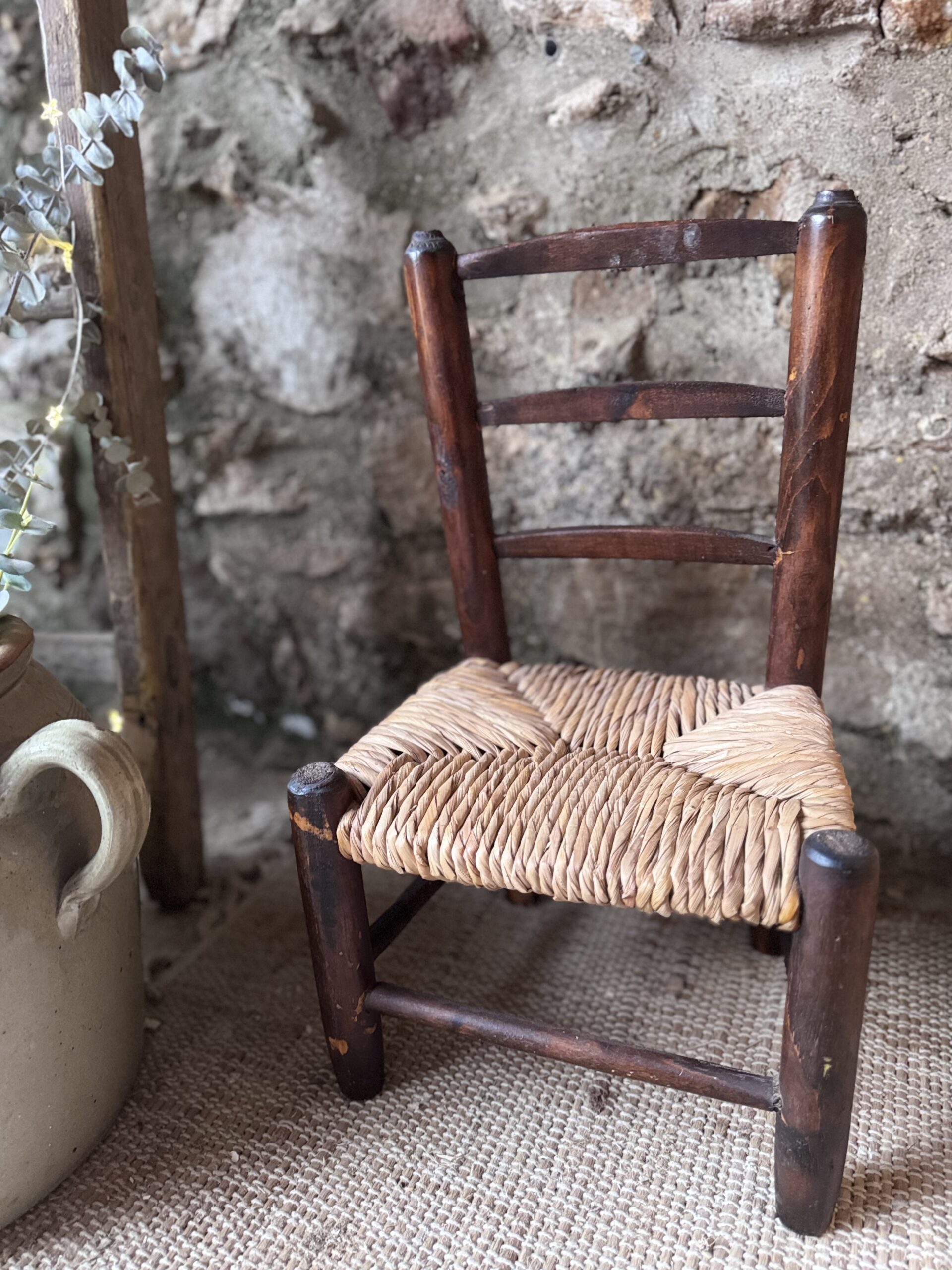 Charmante petite chaise enfant vintage en bois foncé avec son assise en paille tréssée à la main. Elle sera parfaite en décoration dans une chambre d’enfant ou un salon autour d’une table basse.