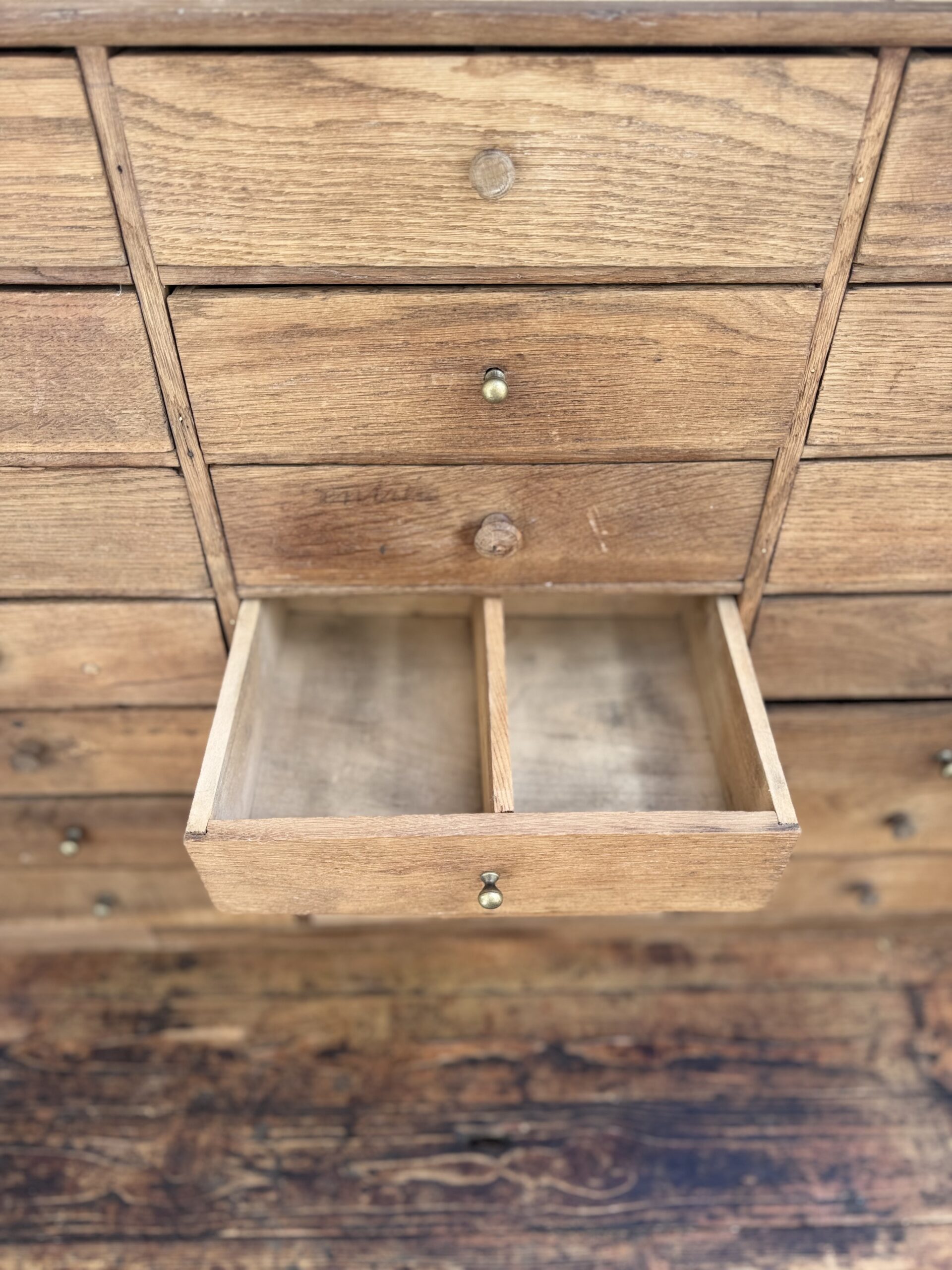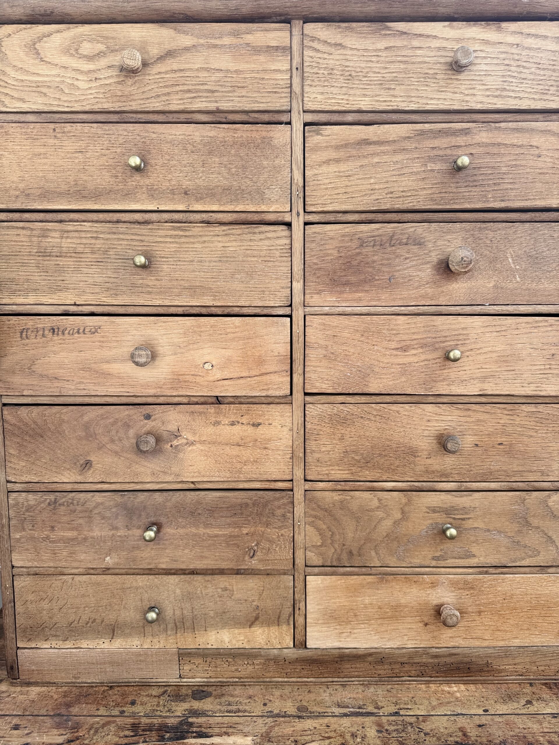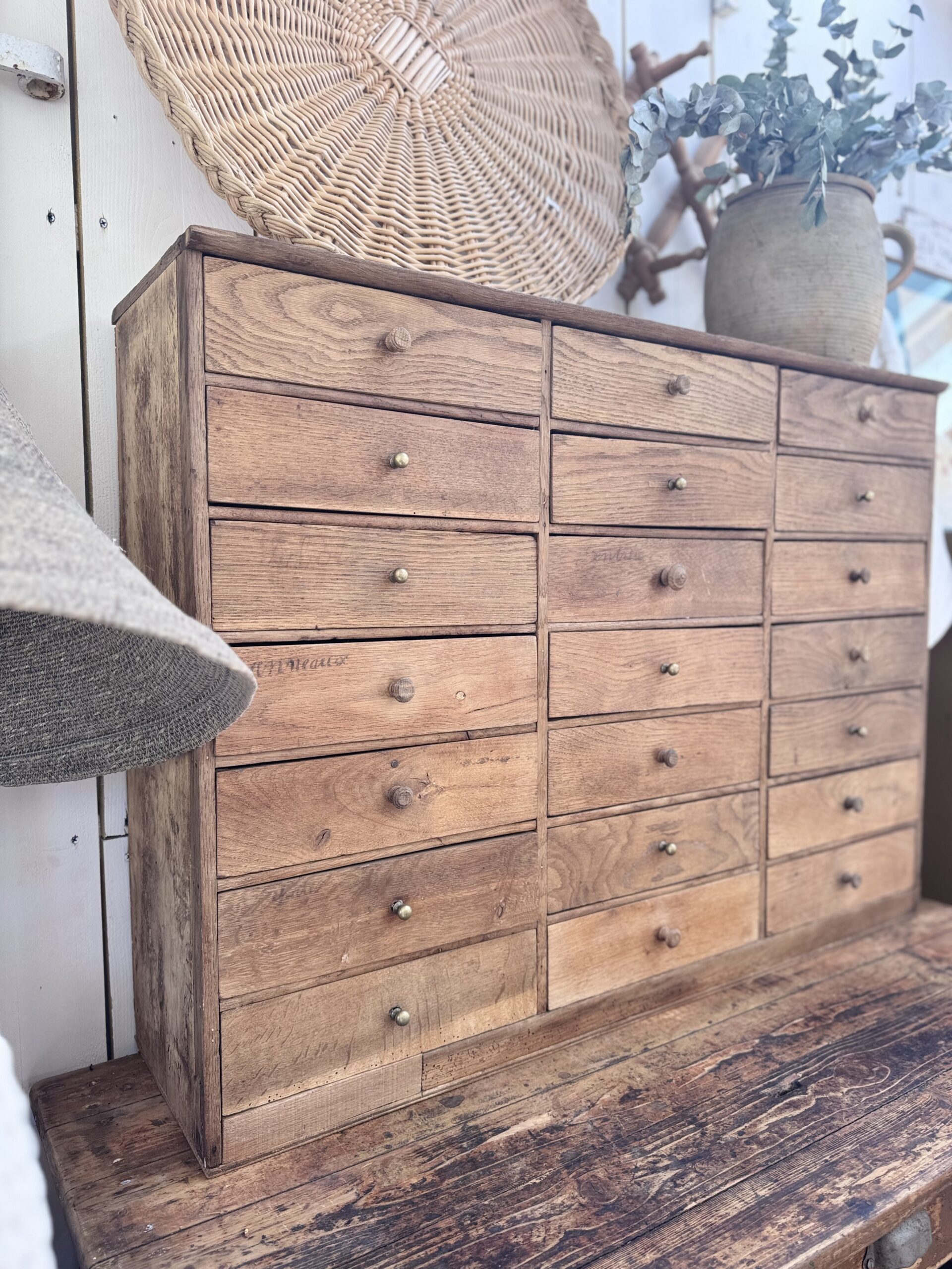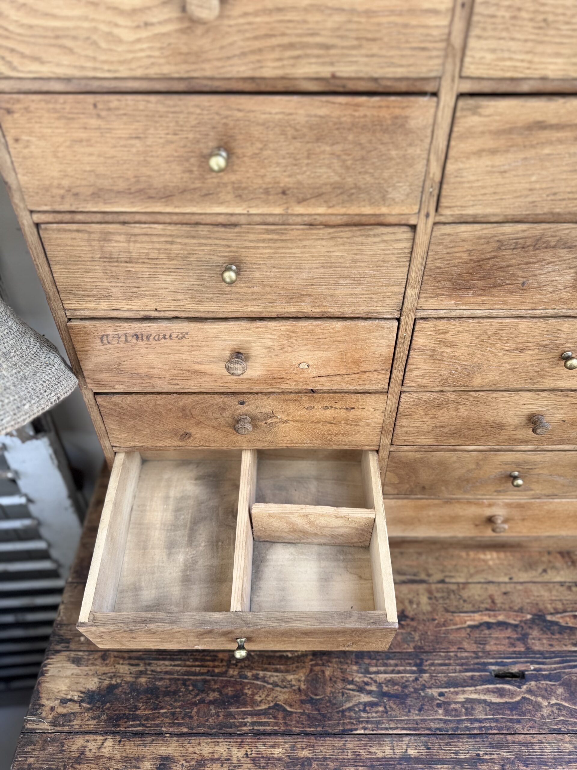 Un beau meuble de rangement authentique, dont j’ai choisi de préserver les traces de son passé : écritures d’origine sur certains des 22 tiroirs compartimentés, boutons d’origines mêlés à de belles poignées en laiton… autant de détails qui le mettent en valeur.