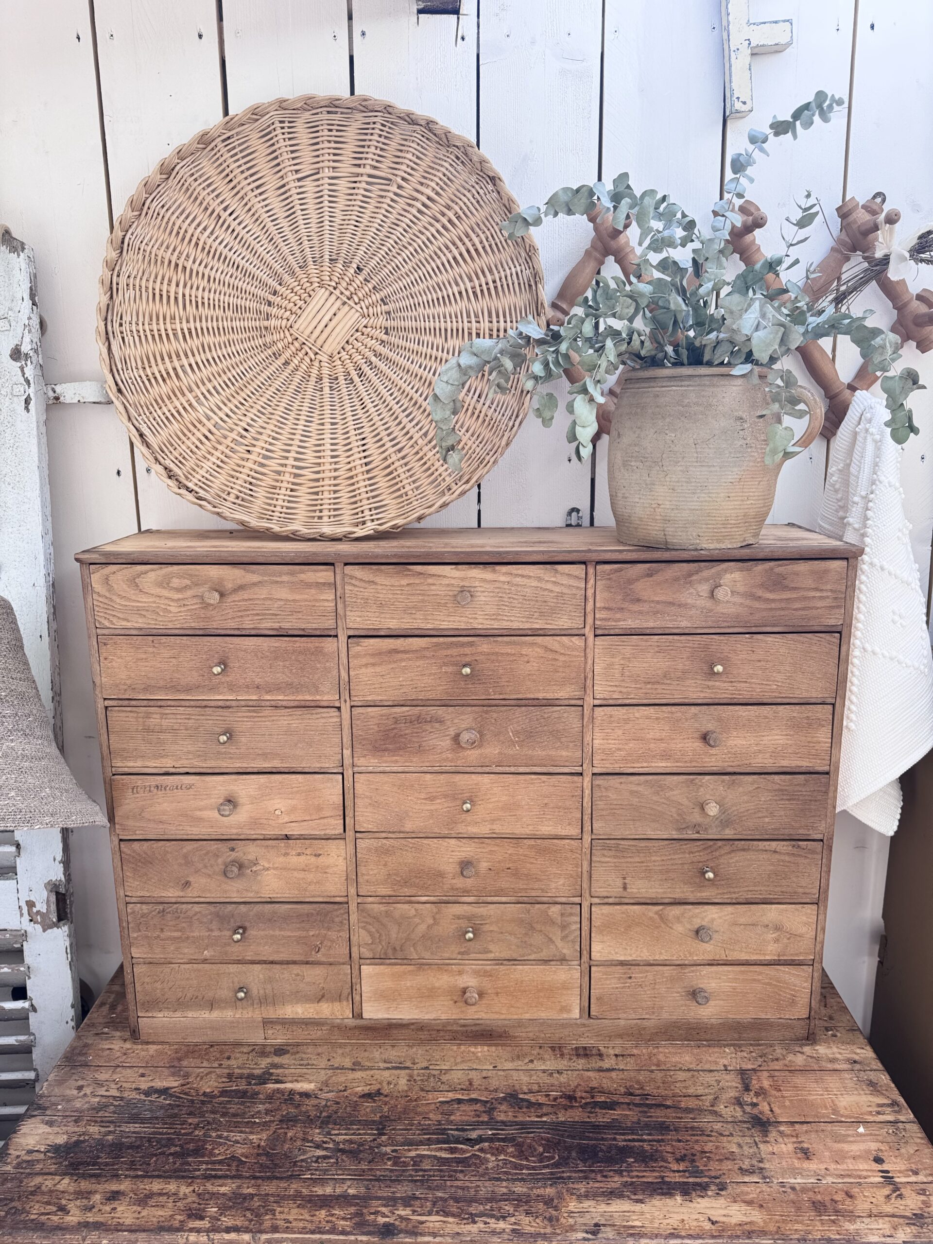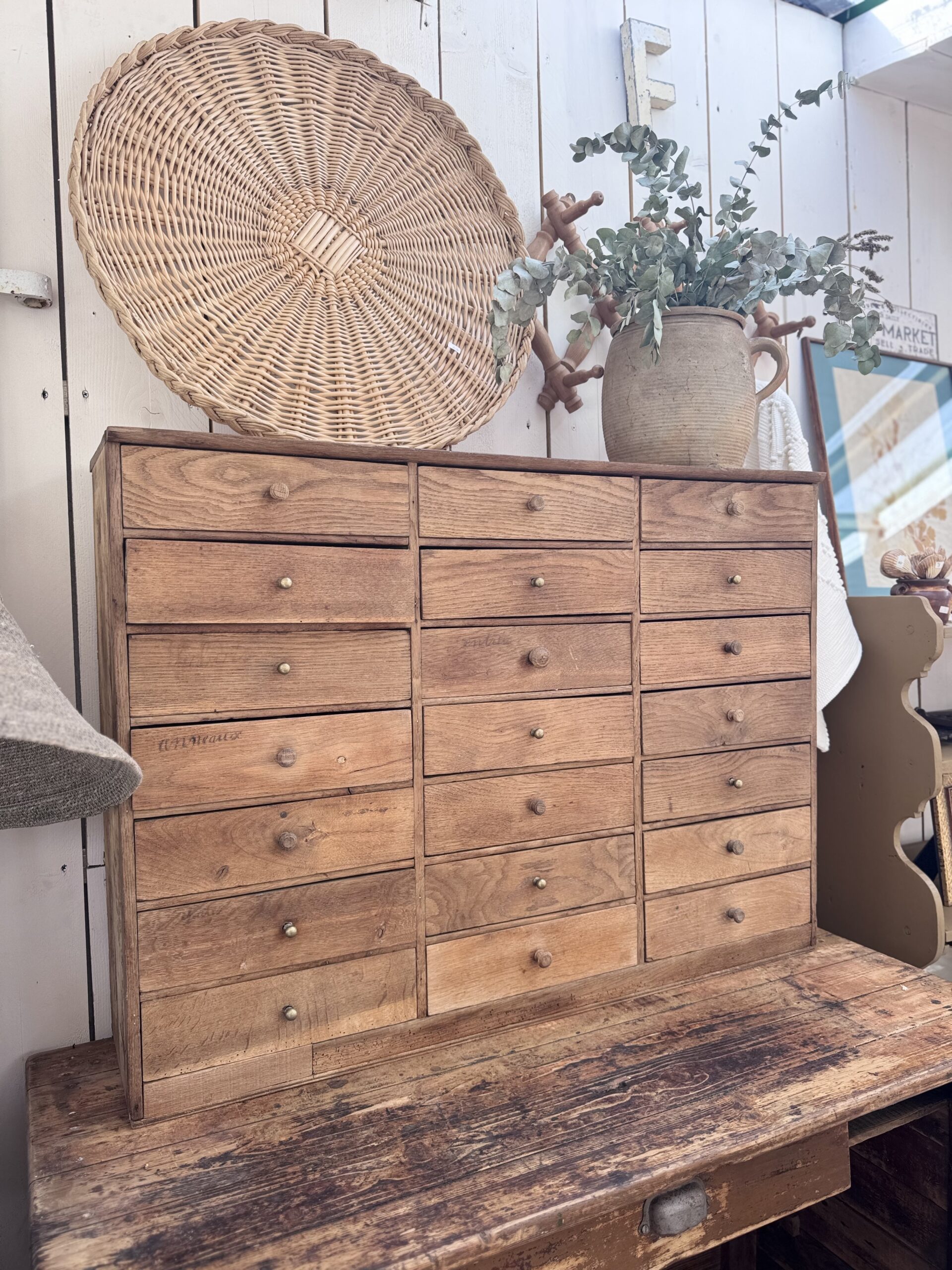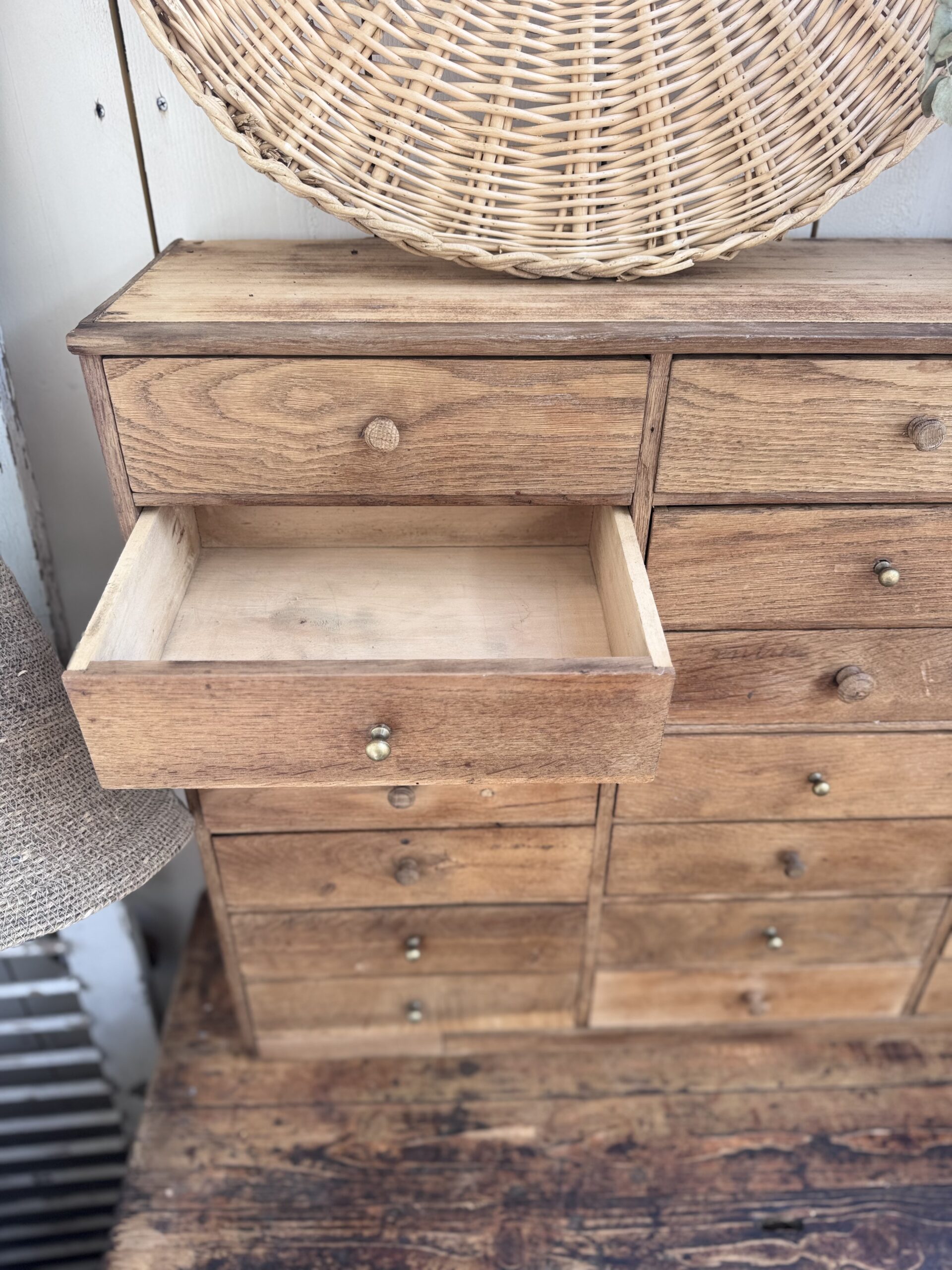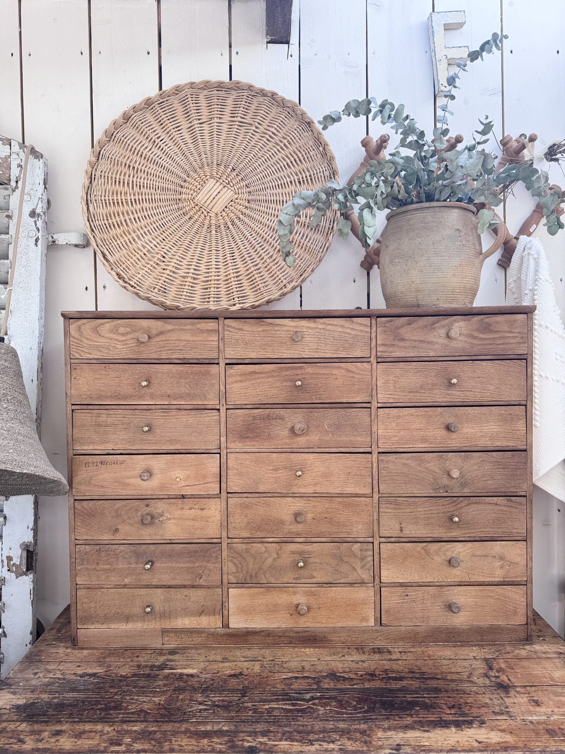 Un beau meuble de rangement authentique, dont j’ai choisi de préserver les traces de son passé : écritures d’origine sur certains des 22 tiroirs compartimentés, boutons d’origines mêlés à de belles poignées en laiton… autant de détails qui le mettent en valeur.