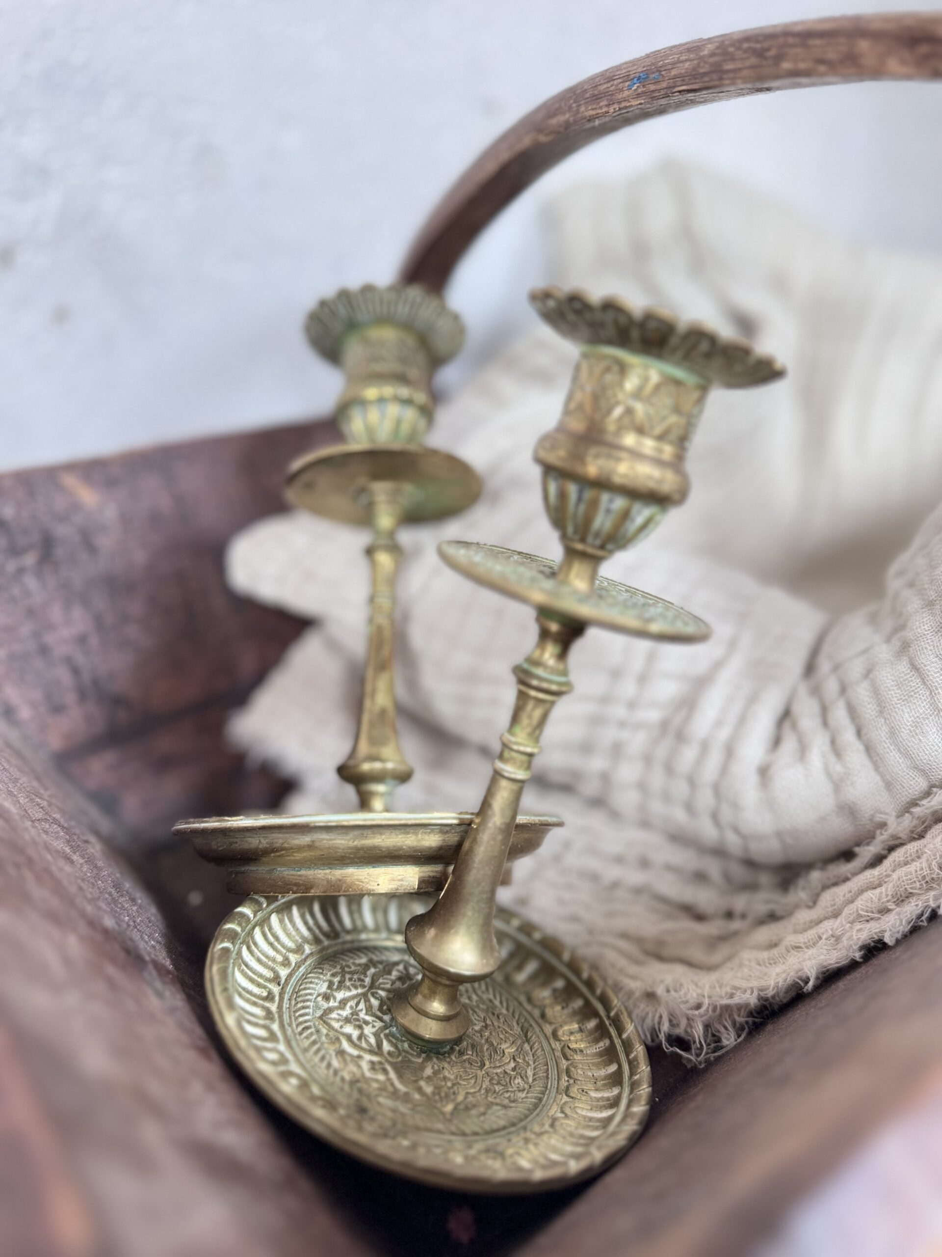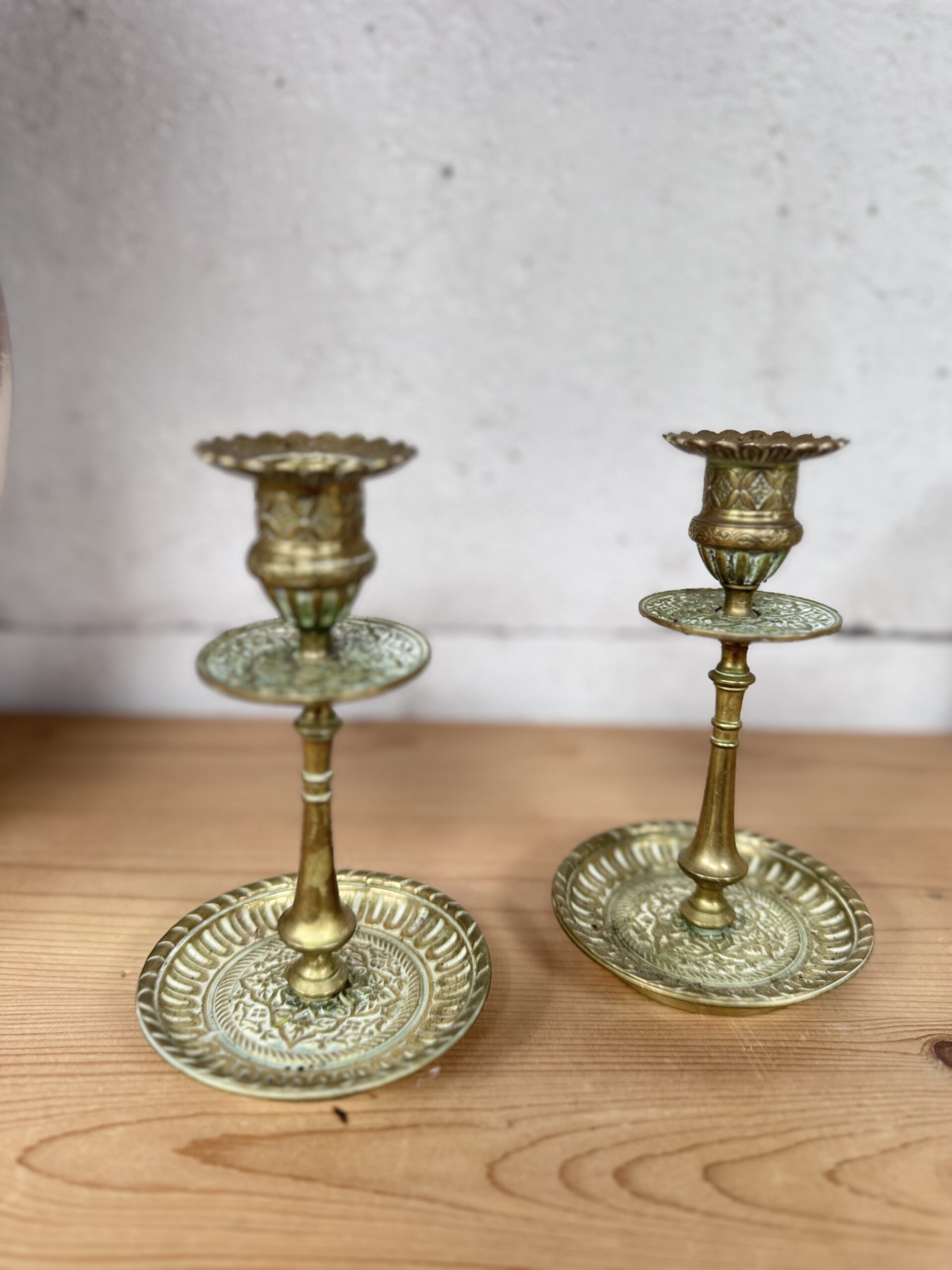 Très belle paire de bougeoirs anciens finement travaillés avec des motifs gravés.